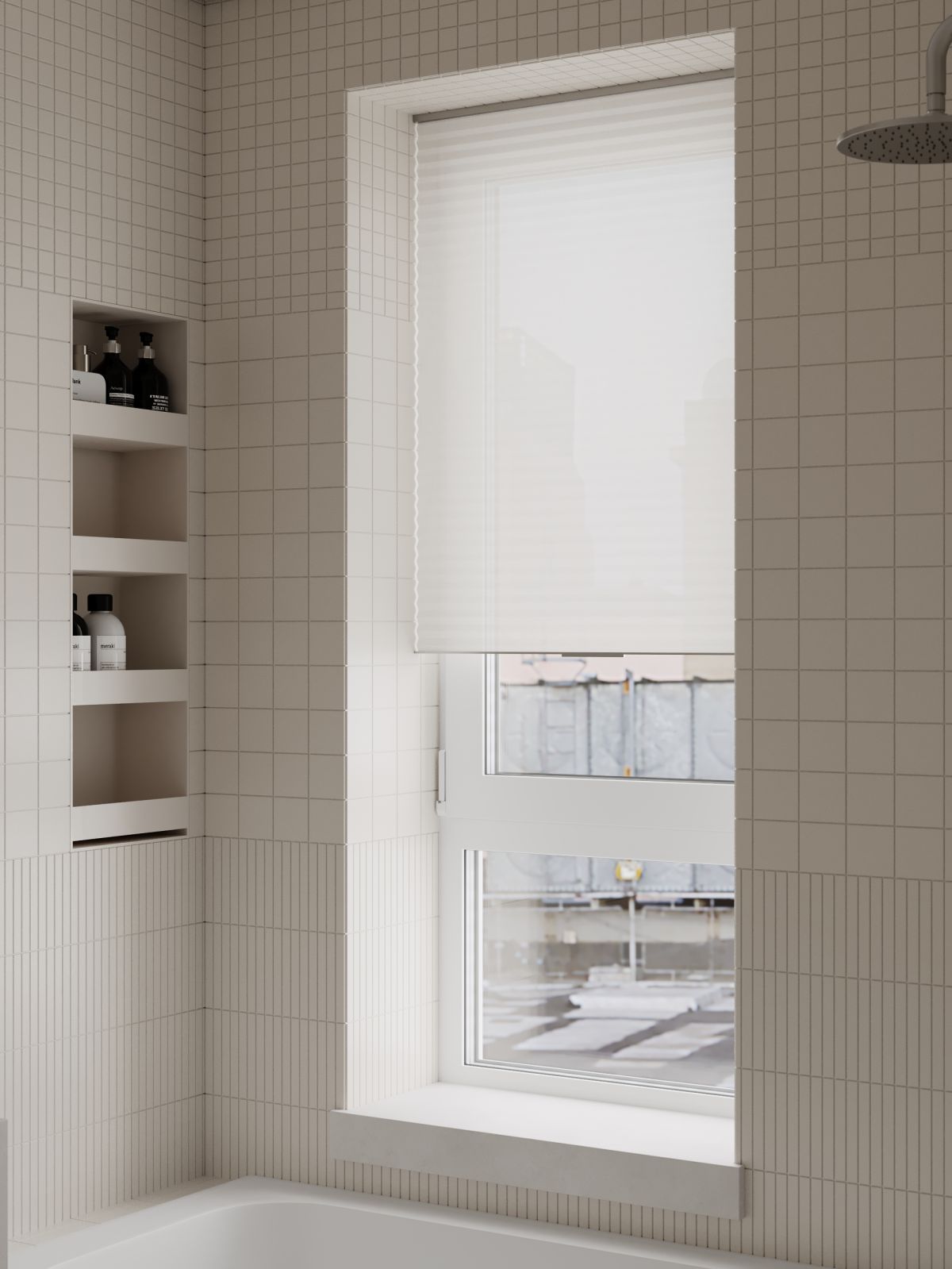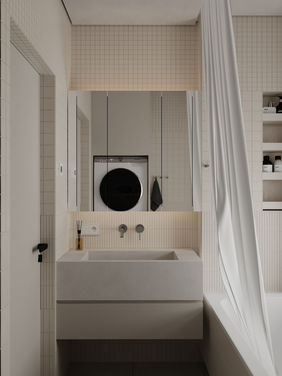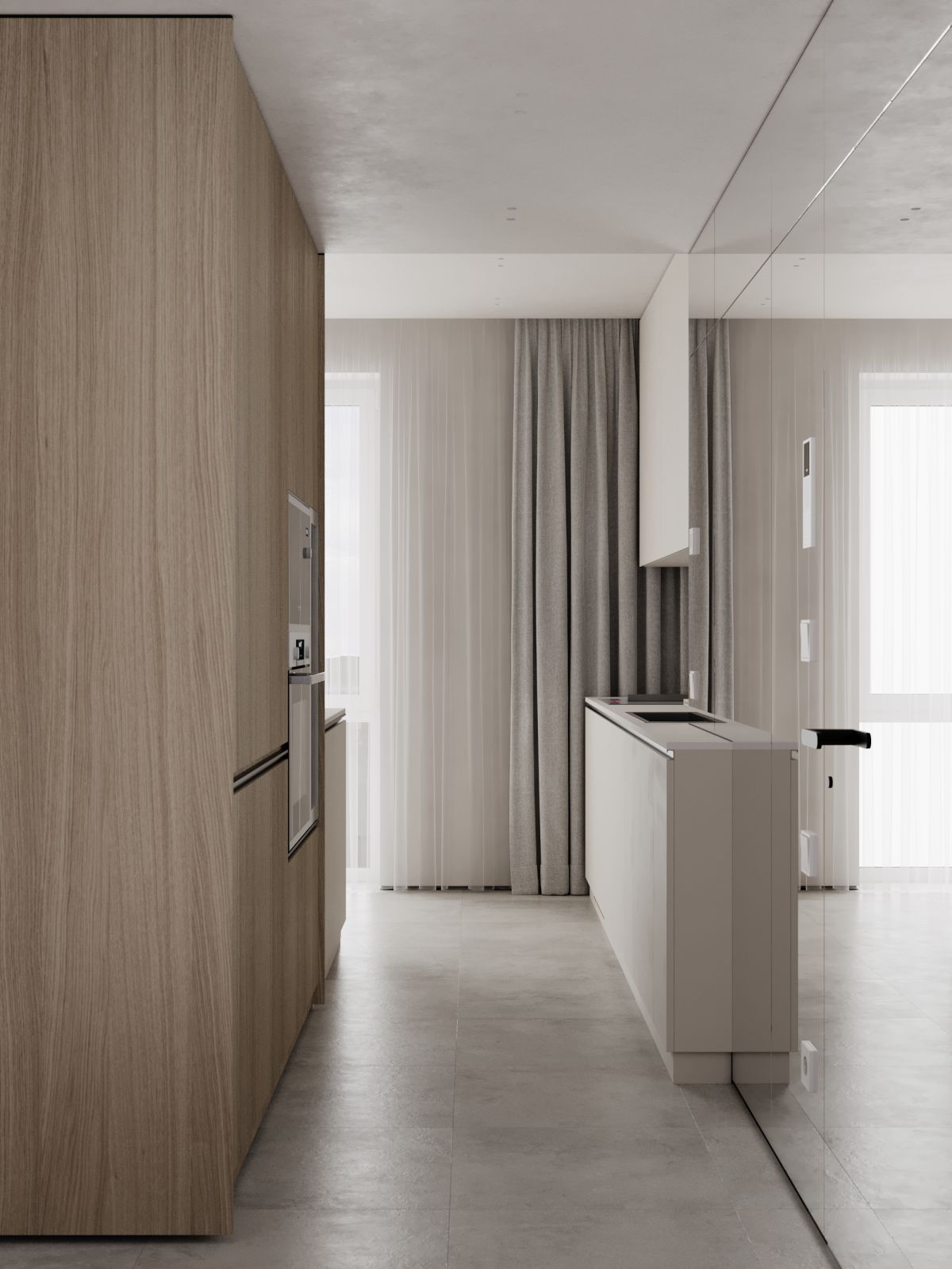 Интерьер выдержан в светлых оттенках с акцентом на использование шпонированных панелей из березы, что придает помещению теплоту и уют. Мягкие линии в виде скругленных углов перегородок и мебели добавляют ощущение плавности. В отделке стен использована высококачественная штукатурка под покраску, на полу — широкоформатный к и дерево. В ванной комнате применена керамическая плитка WOW в единой цветовой гамме, но с вариацией размеров, что создает уникальную текстуру и подчеркивает пространство.