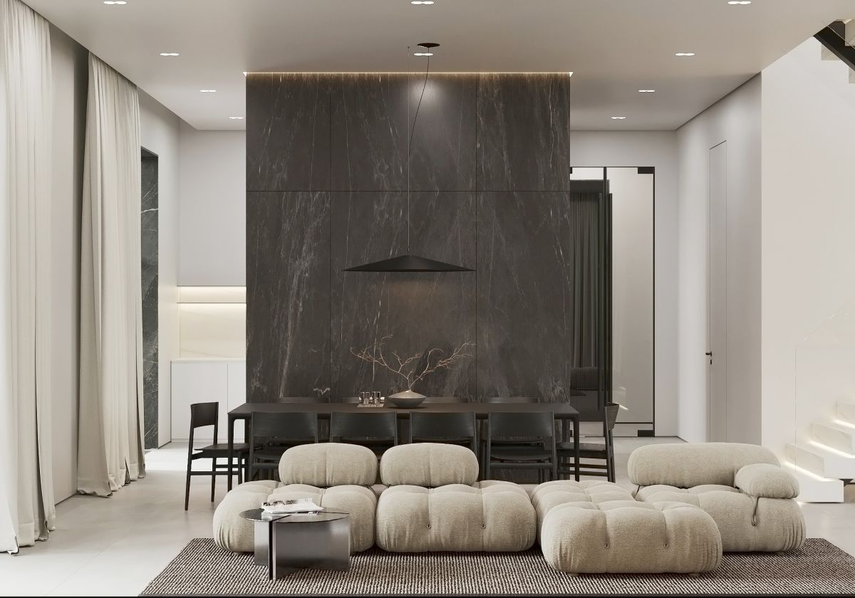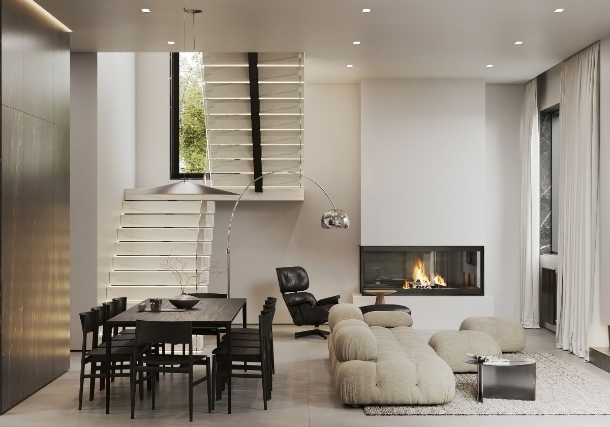 Сам коттедж расположен в живописной лесной зоне. Получившийся интерьер стал воплощением идеального сочетания гармонии с природой и современного дизайна. что создает уникальную атмосферу уюта и спокойствия.