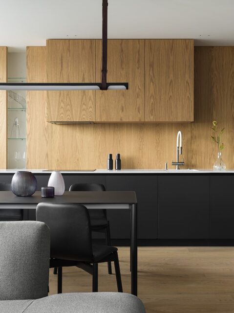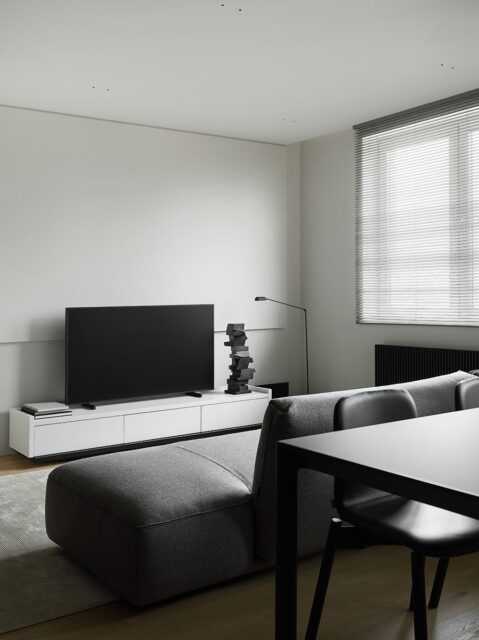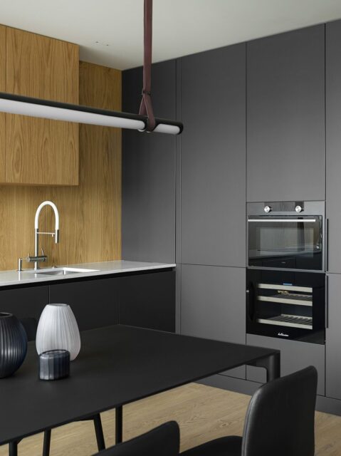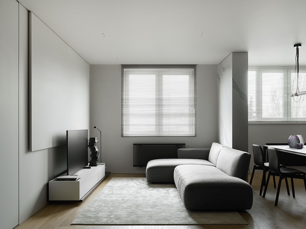 Монолитный пилон в гостиной отделан широкоформатным керамогранитом, как и ниша в кухне.
