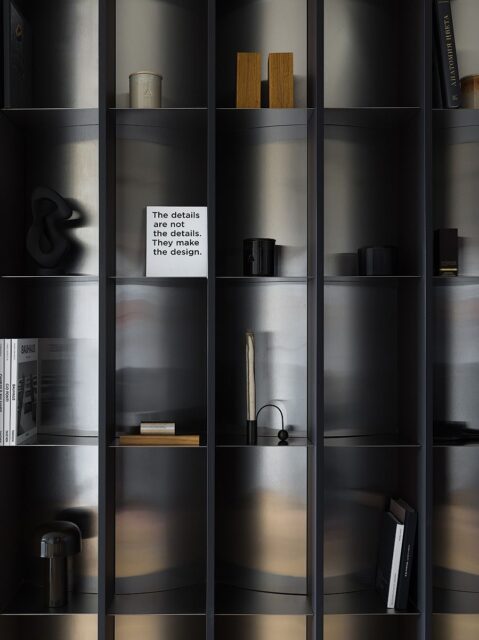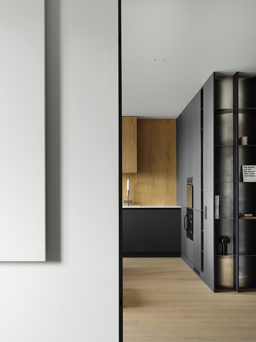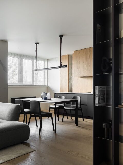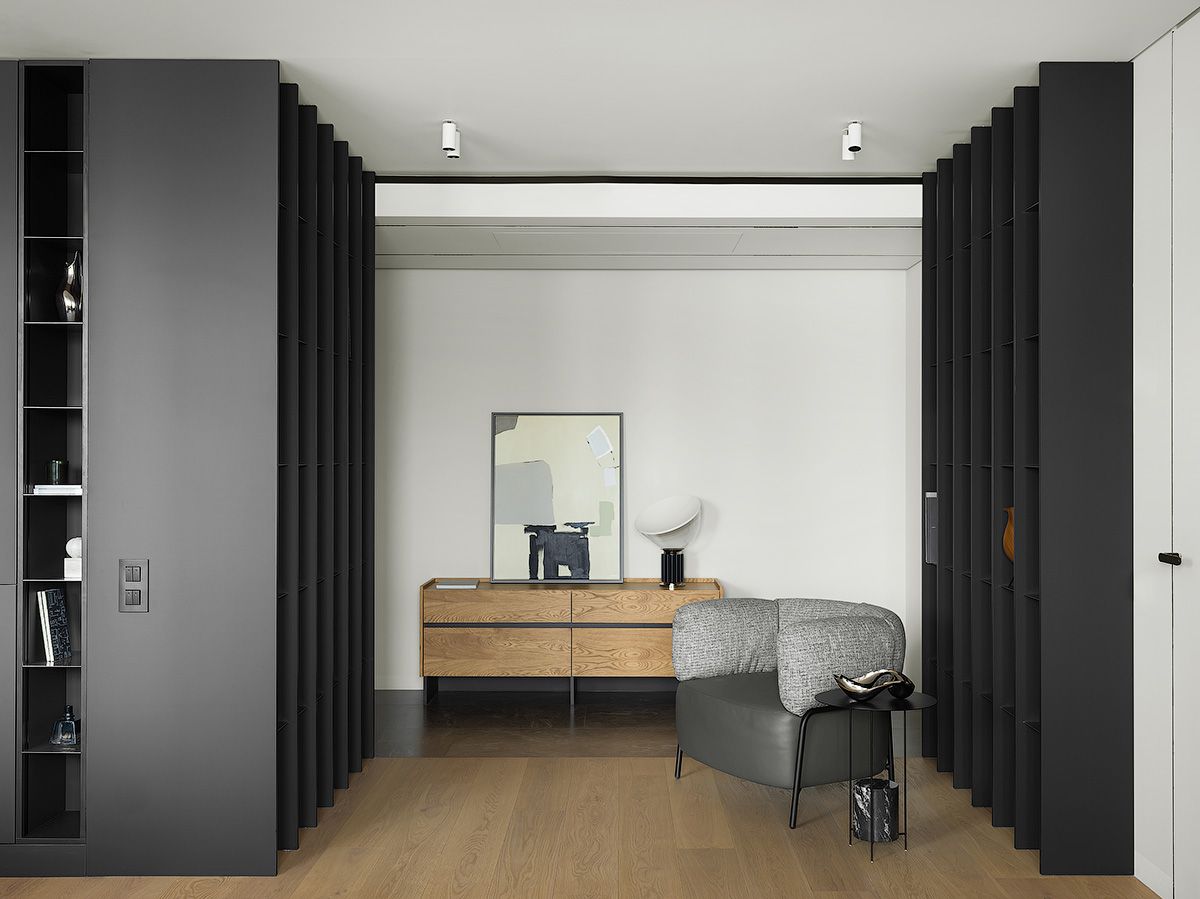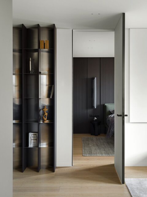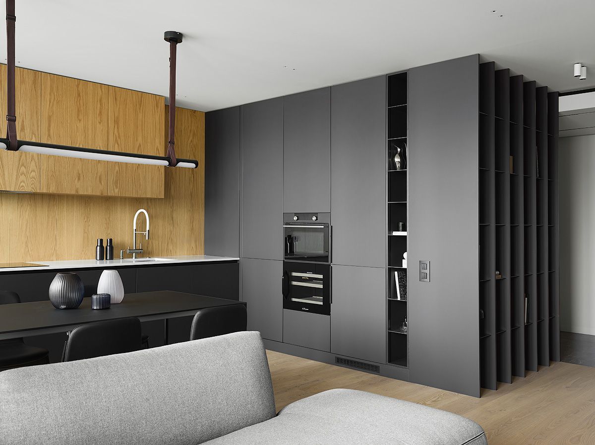 Современная квартира для мужчины площадью 69 кв. м. Интересная деталь — кастомные полки из нержавеющей стали, которые расположены в центре квартиры, и разделяют входную часть, коридор и ванную от гостиной спальни.