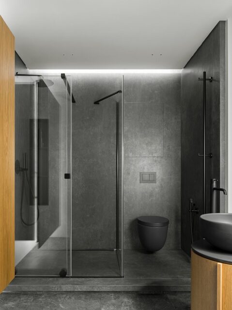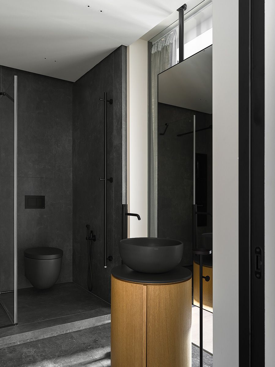 Оригинальное и смелое решение — окно между ванной и спальней. Ванная в серых оттенках, в благородном сочетании с натуральным деревом. Душ на подиуме дает визуальную дополнительную фигуру в общем пространстве, для дополнительного эффекта выполнен в другой плитке.