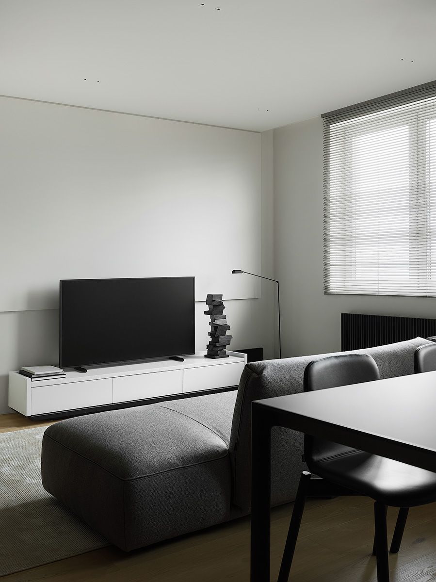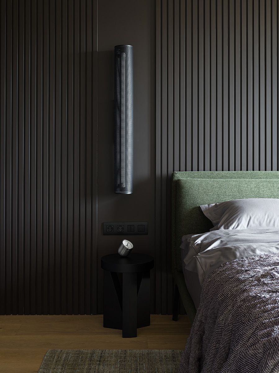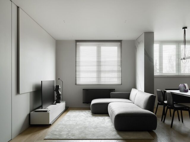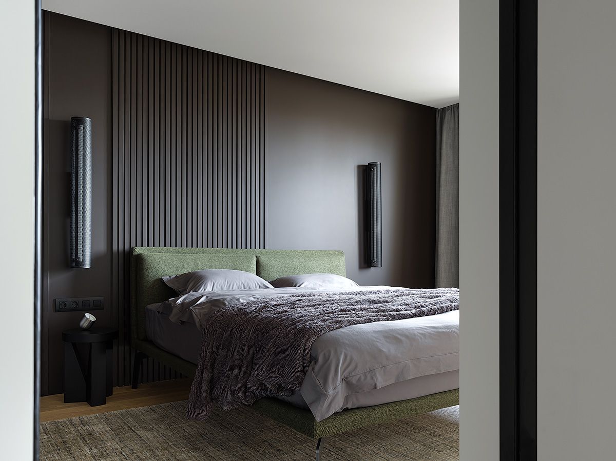 Жалюзи на окнах подчеркивают графичность и чистоту интерьера. Только в спальне добавлена мягкость текстилем — портьеры нейтрального серого оттенка, и декоративное покрывало, которое небрежно украшает пространство.
