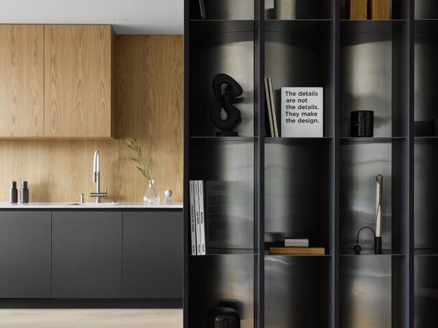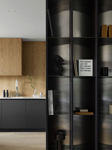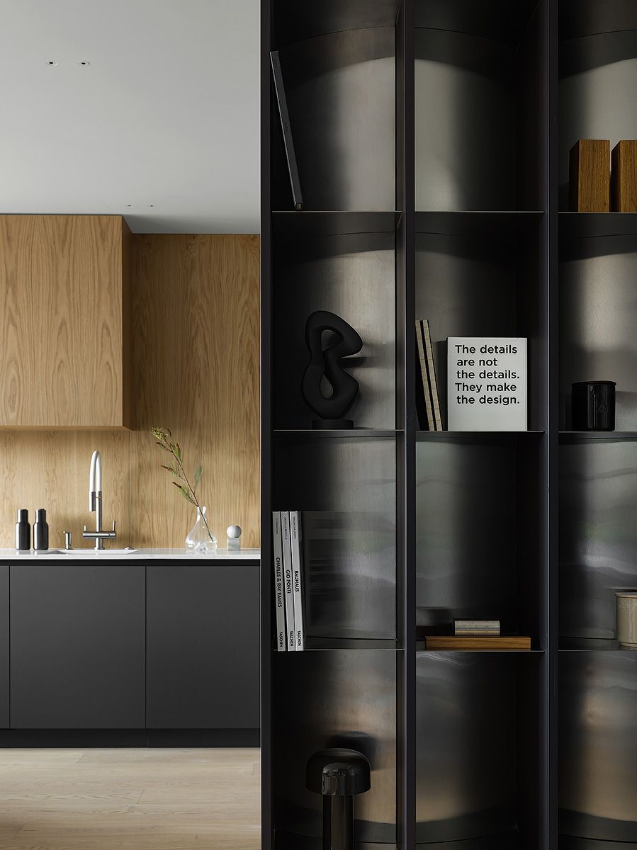 Современная квартира для мужчины. Интересная деталь — кастомные полки из нержавеющей стали, которые расположены в центре квартиры, и разделяют входную часть, коридор и ванную от гостиной спальни.