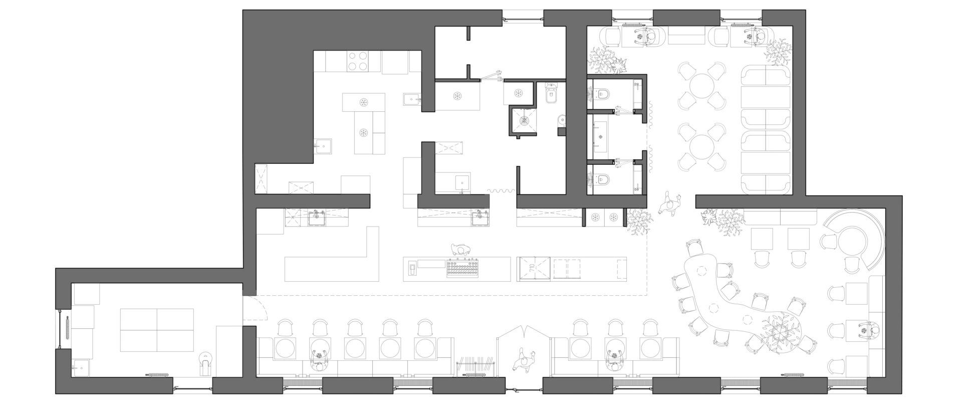 Помещение состоит из 2-х залов, основной вытянутой формы, достаточно светлый с 5 окнами, выходящими на набережную г. Саратова и видом на Волгу, малый зал более камерный. Так же из основного зала мы видим за стеклом кондитерский цех. Барная стойка поделена на 3 блока: 1 — открытый блок, пекарня и 2 — кофейный блок с кофемашиной, 3 — выпечка и вино.