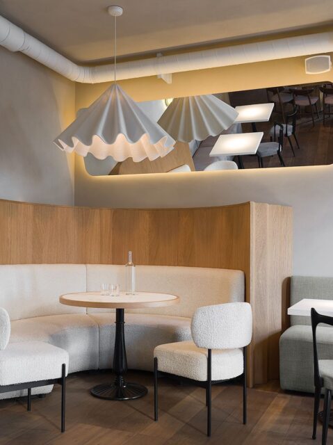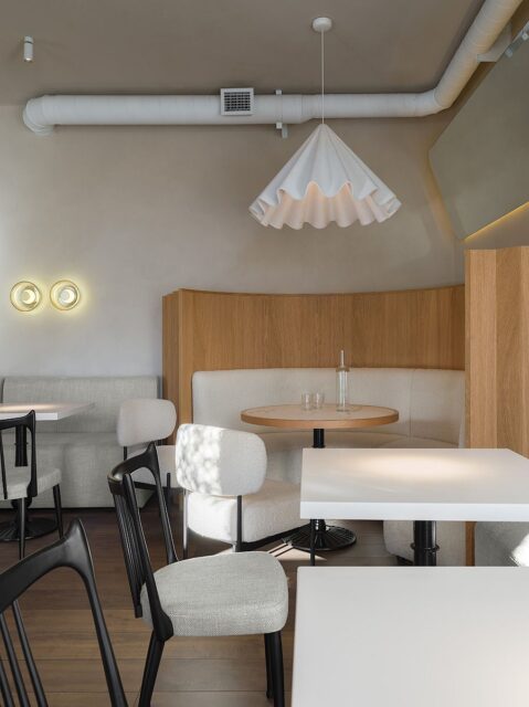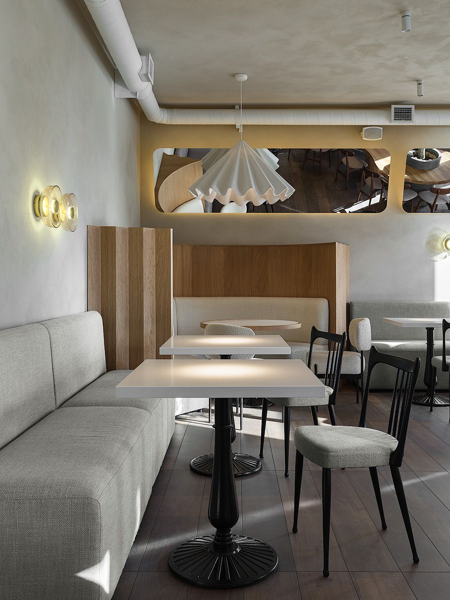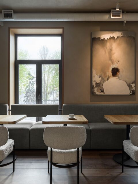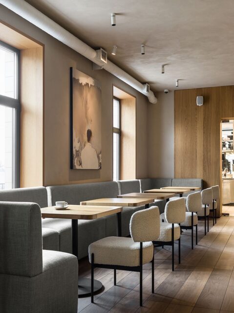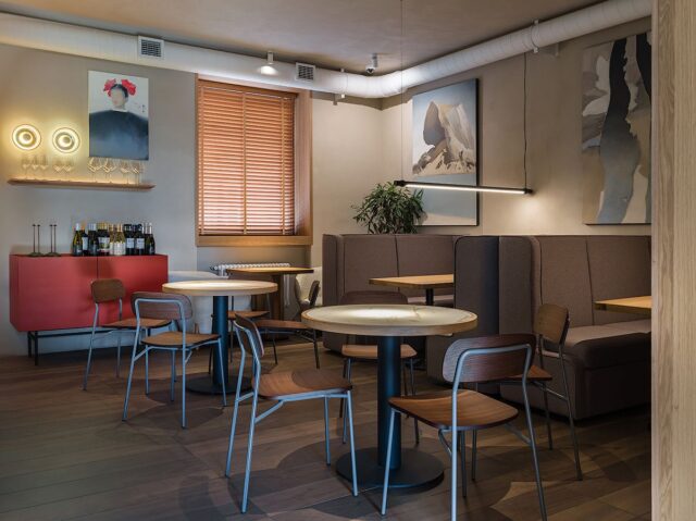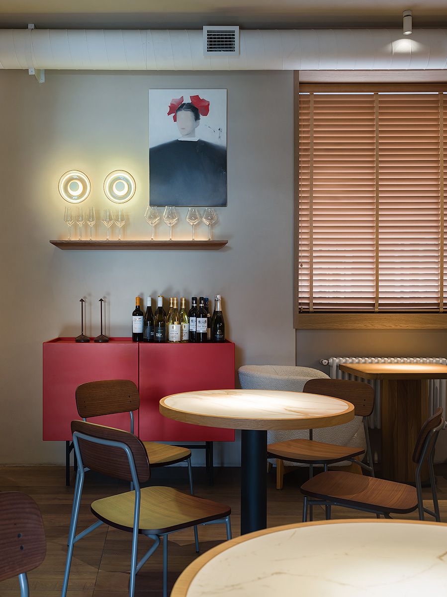 Яркий акцент в основном зале — алая кофемашина и стойки официантов цвета красного вина. Фасады барной стойки выполнены из тонированного шпона
