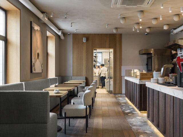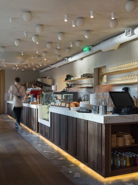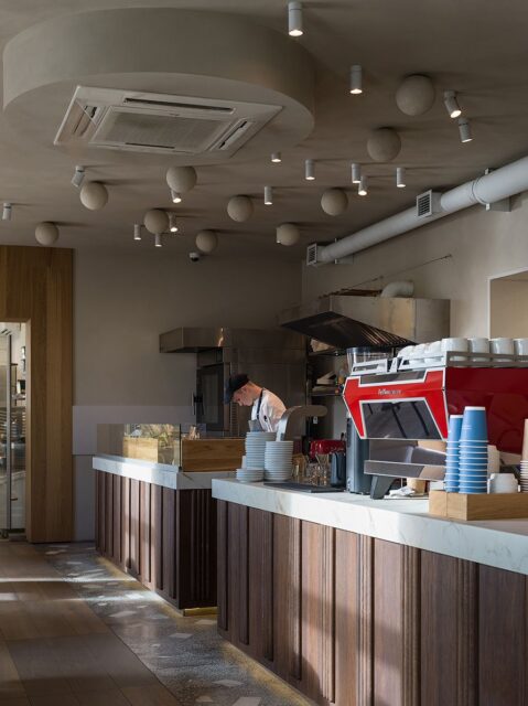 Барная стойка поделена на три части: открытый блок с пекарней, кофейная зона и уголок с выпечкой и вином.