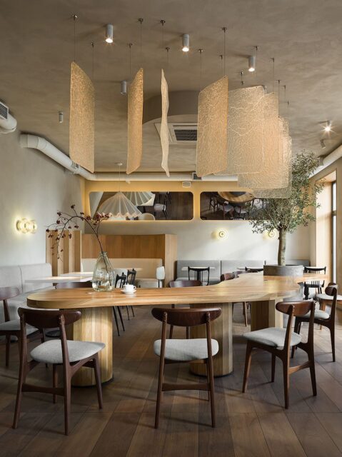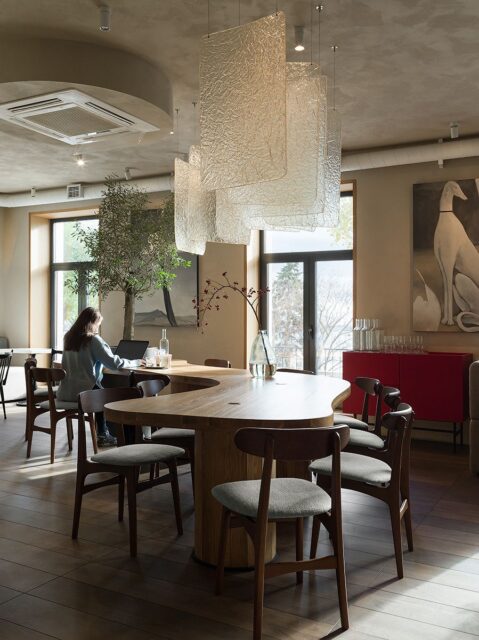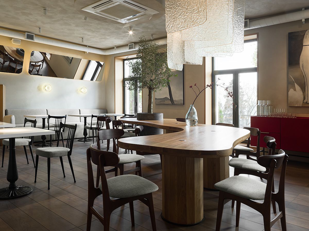 Центральный стол — особенный элемент интерьера: его форма повторяет изгибы Волги. Живая олива, «вырастающая» из стола, отсылает к тему Италии и ее национальной кухне, которой вдохновлялся заказчик.