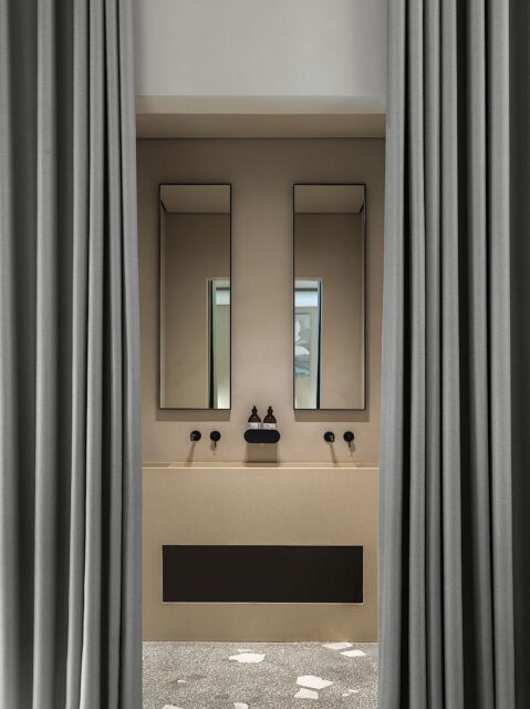 дуба, столешница из керамогранита рифмуется со вставками из терраццо.