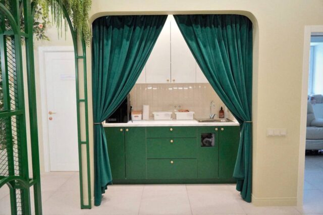 Во всем дизайне прослеживается природные мотивы. Акцентным цветом мы сделали глубокий зеленый, который выигрышно сочетается с золотым и бежевым.