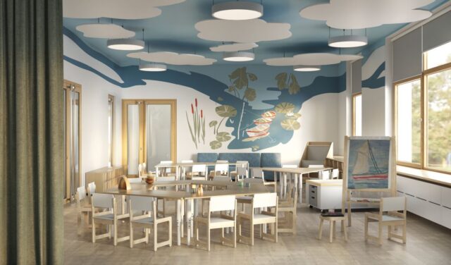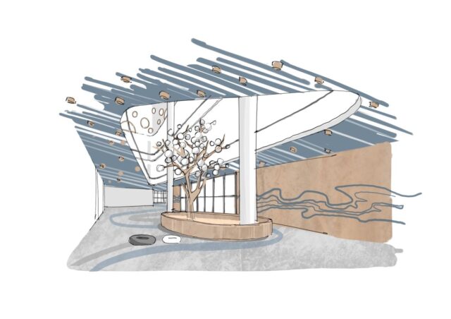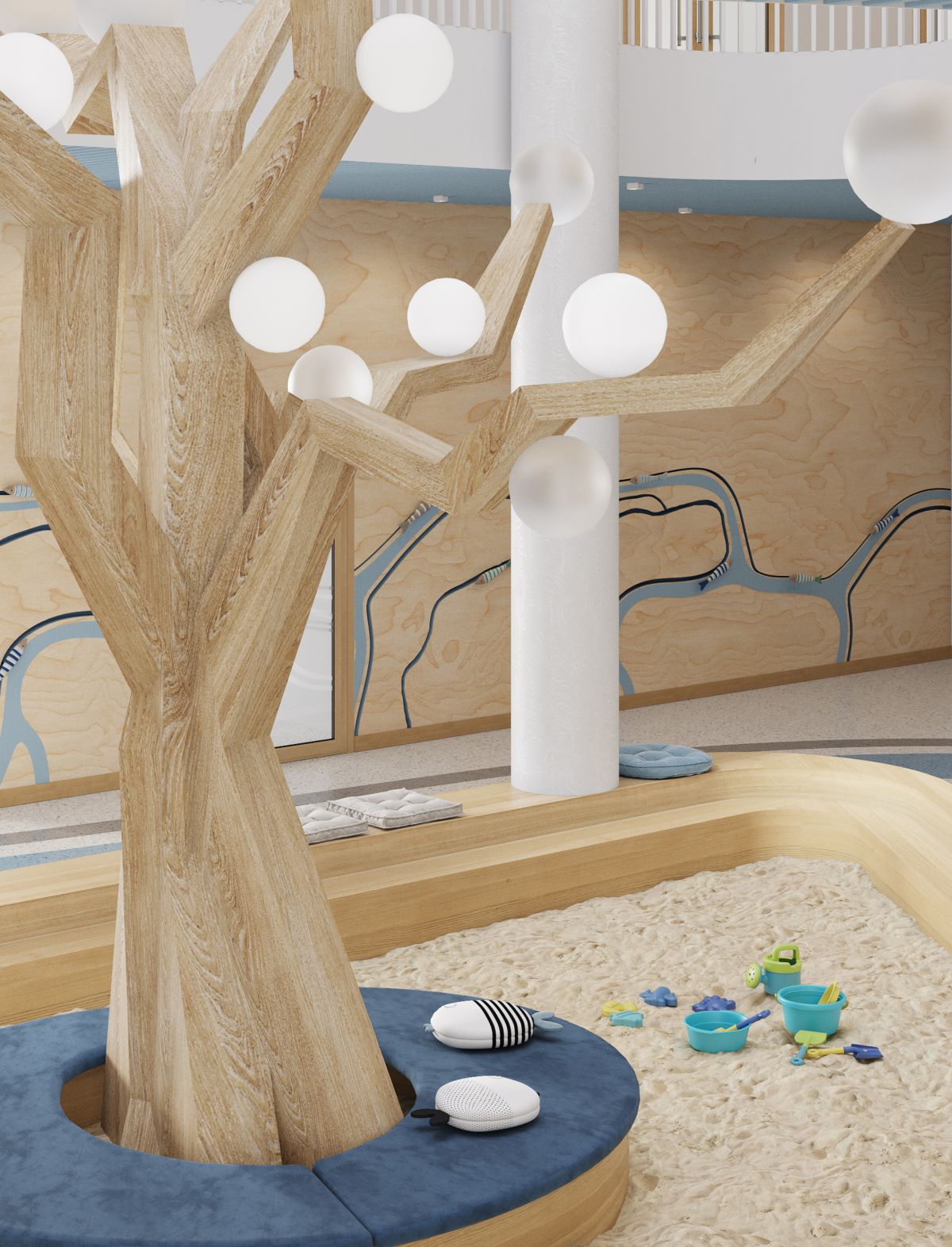 Объект расположен вблизи природного заповедника «Долина реки Сетунь». Отсюда берет начало концепция интерьера — идея течения реки как непрерывного источника жизни, движения и потока знаний. Она помогает познакомить детей с миром животных, растений и при этом дает им чувство безопасности и единения с природой.