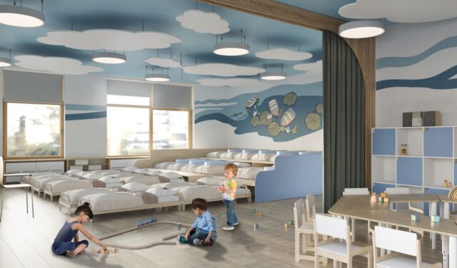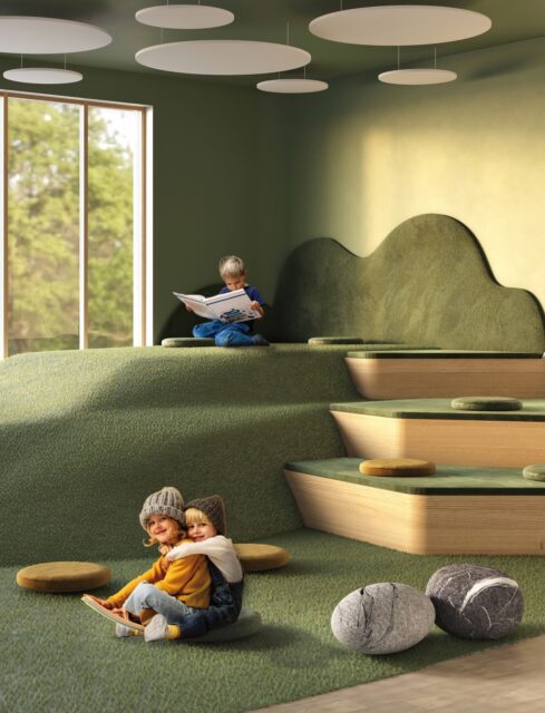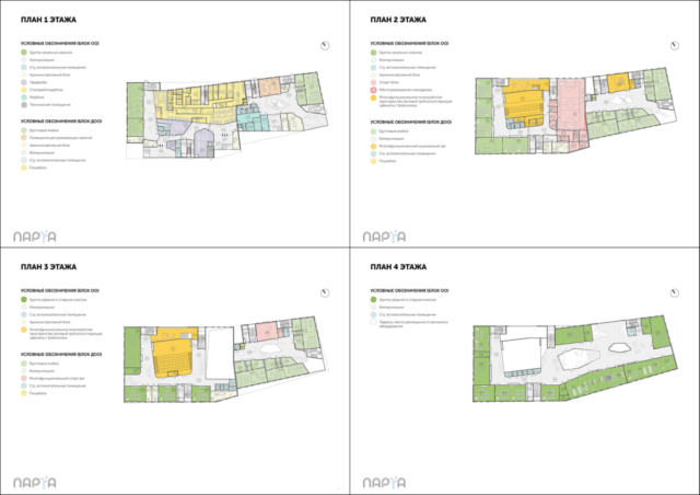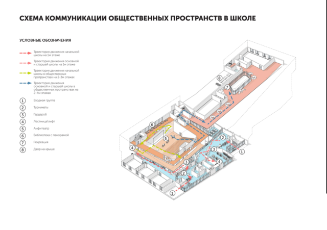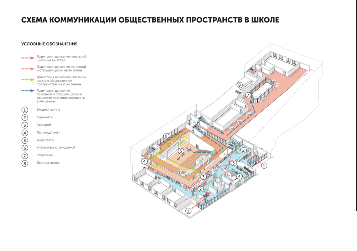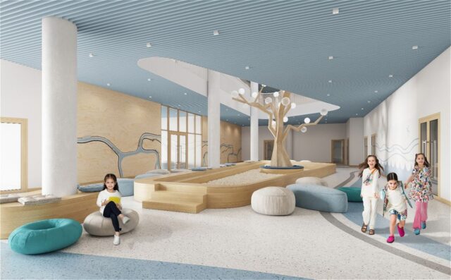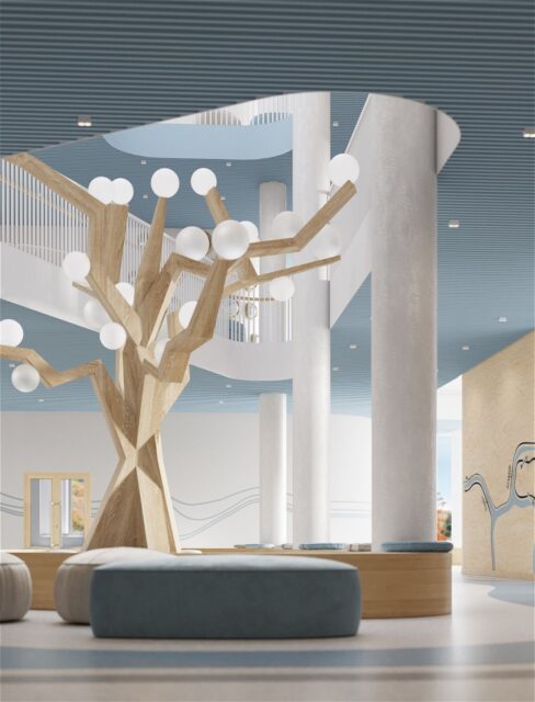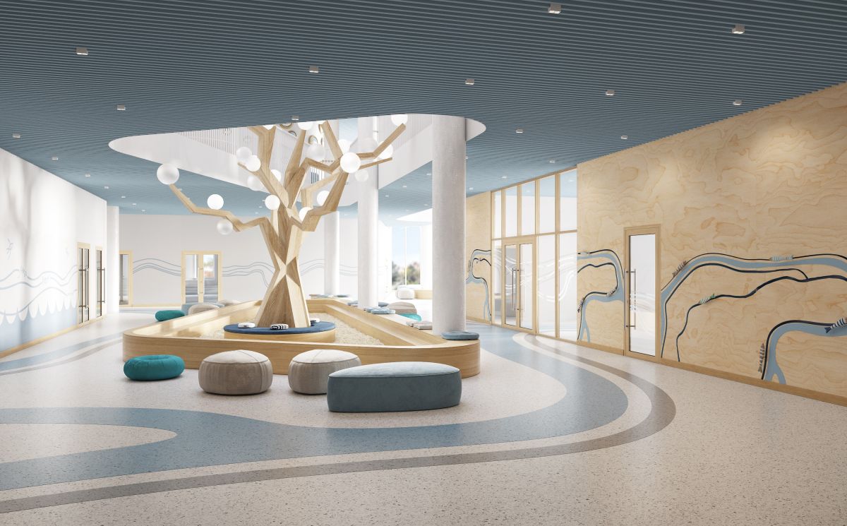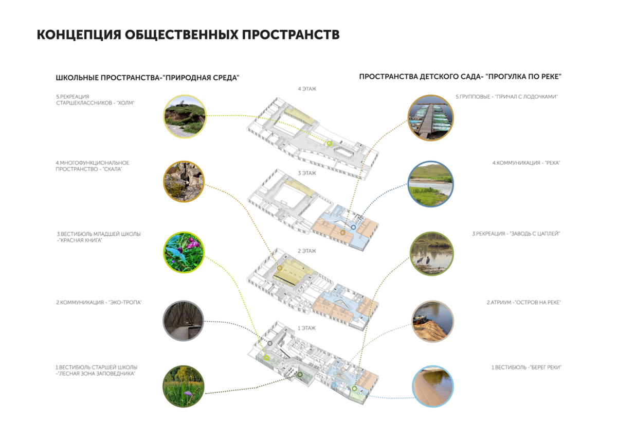 Пространства четырех этажей здания поделены на зоны с говорящими названиями. Так вестибюль для малышей стал «Берегом реки», вестибюль для начальной школы — «Красной книгой», а в старшей школе «Лесная зона заповедника». Все десять пространств повторяют образы природы из своих названий и содержат характерные атрибуты. Эти места безопасны, но при этом увлекательны. В атриуме детского сада возвышается дерево, у подножья которого располагается песочница с местами для сиденья. В рекреации находится горка, по которой можно съехать с верхнего этажа. Из графики на стенах дети узнают о растительном мире родного края. А с помощью линий навигации на полу, в форме игры находят нужный кабинет.