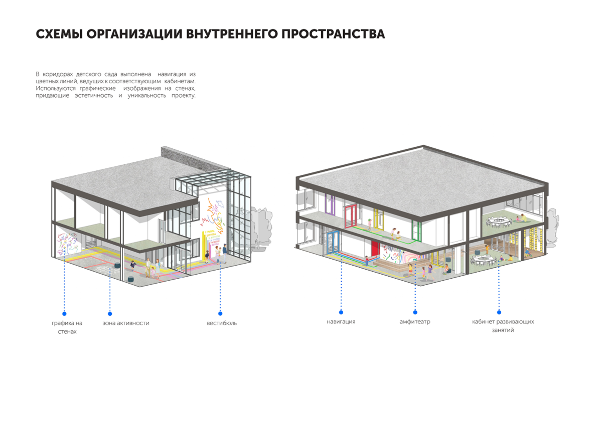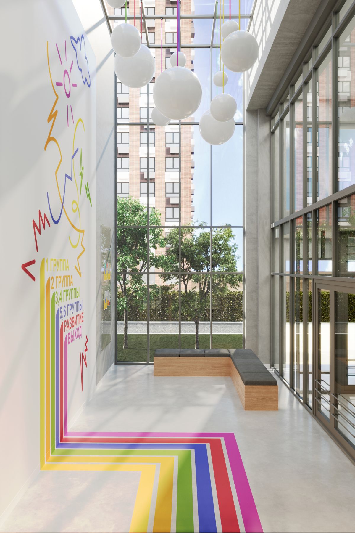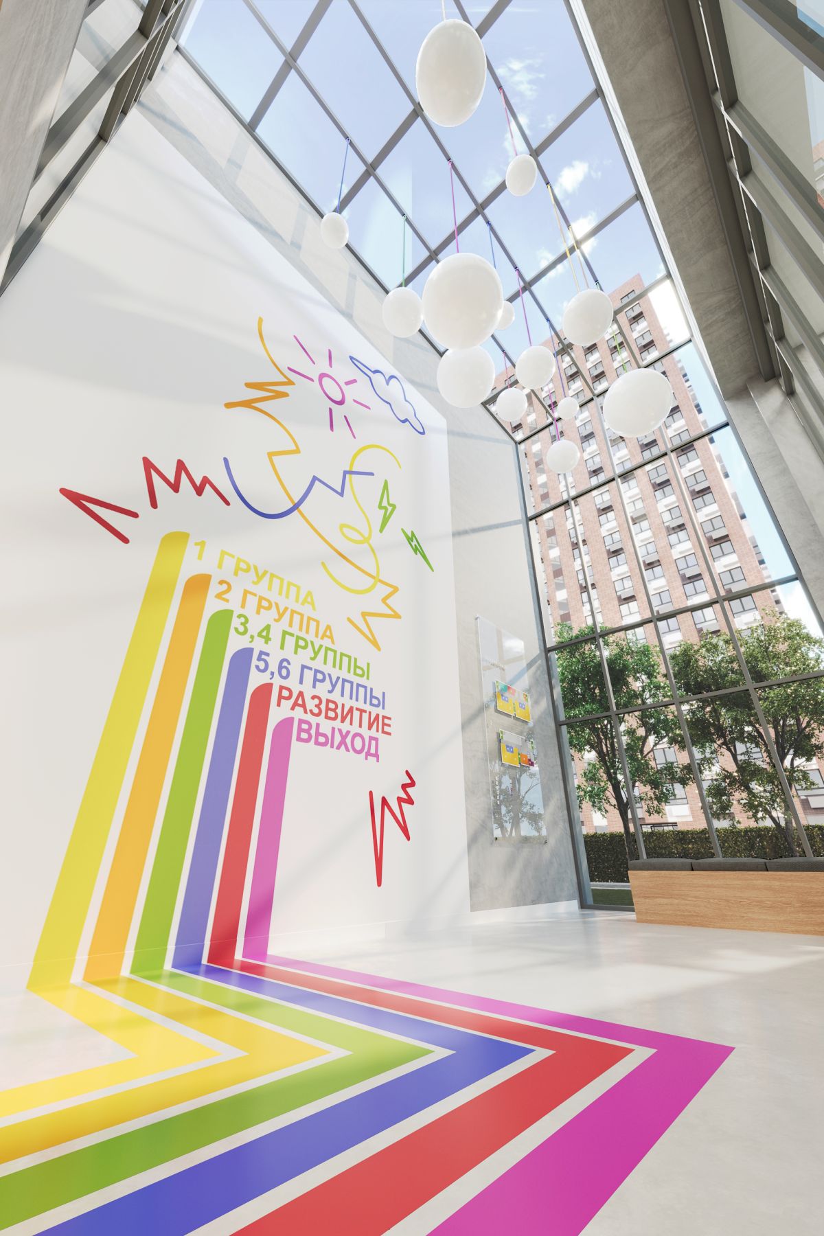 В проекте этого детского сада мы раскрыли непосредственность детского возраста, смелых идей и легкости самовыражения. Художники нашей мастерской разработали серию график, которая проста в нанесении. Она символизирует детский рисунок. В этом рисунке можно найти атрибуты, соответствующие назначению помещения.