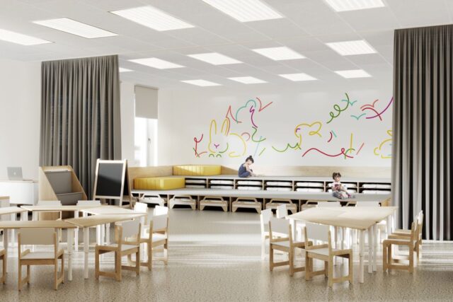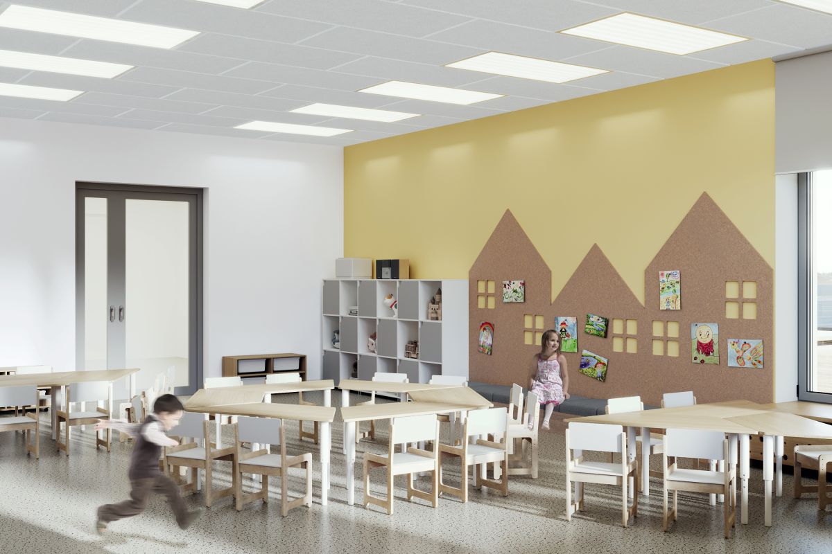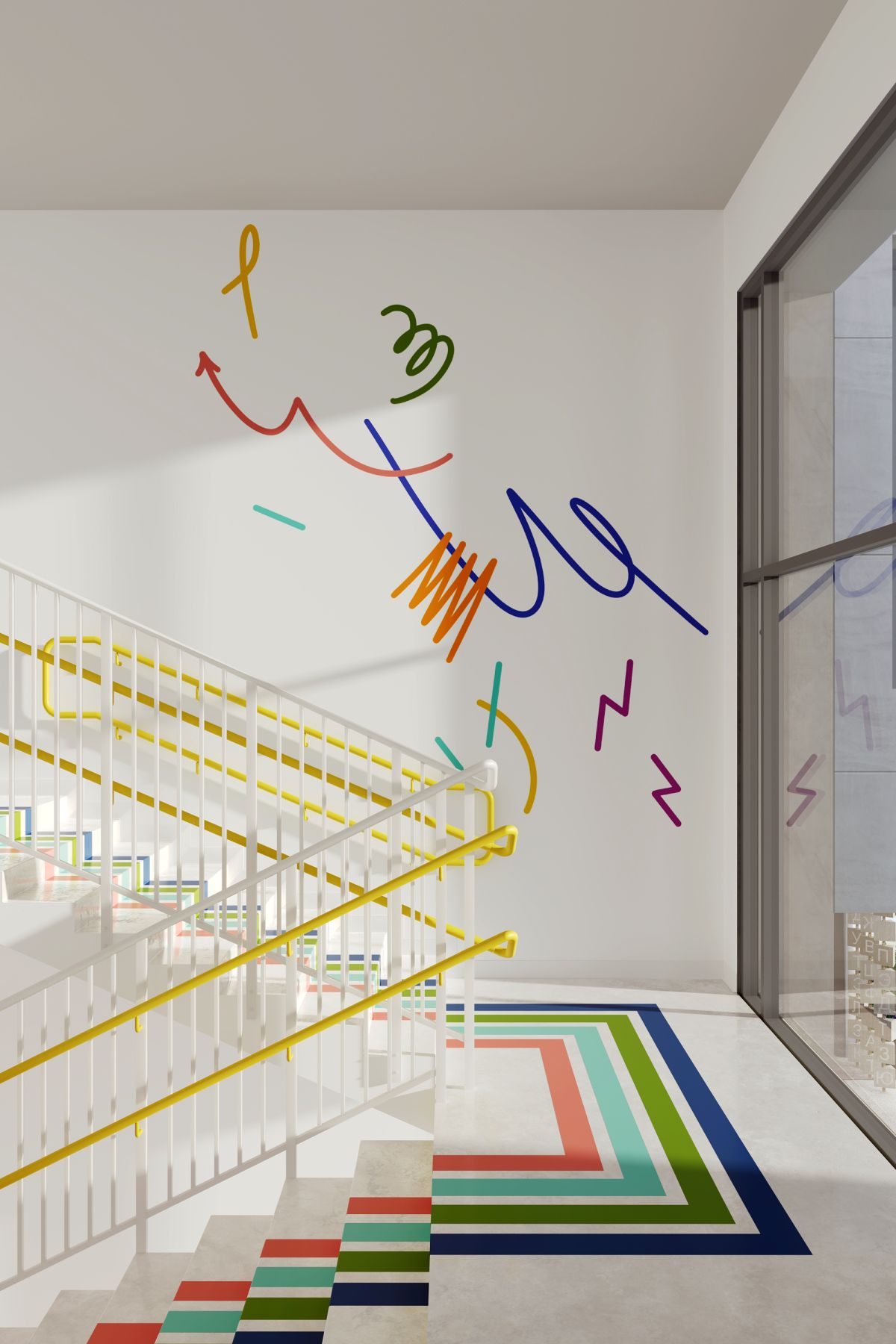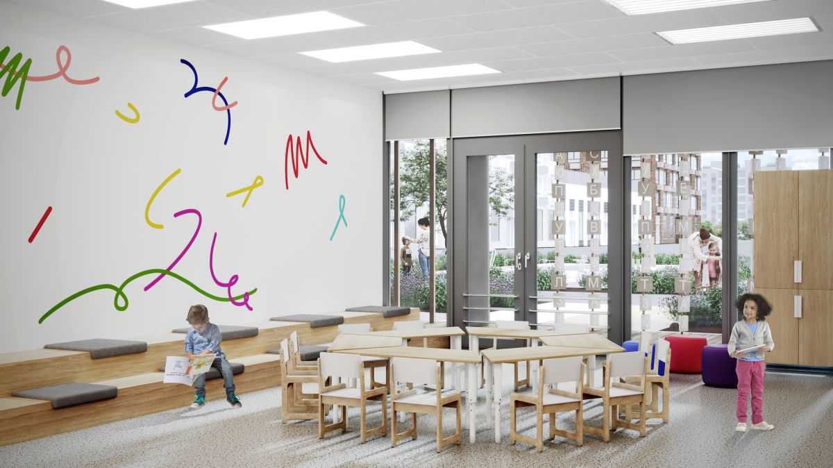 В проекте этого детского сада мы раскрыли непосредственность детского возраста, смелых идей и легкости самовыражения. Художники нашей мастерской разработали серию график, которая проста в нанесении. Она символизирует детский рисунок. В этом рисунке можно найти атрибуты, соответствующие назначению помещения.