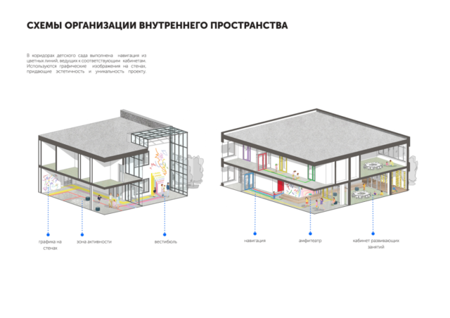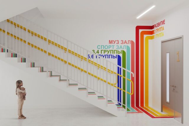 Важным элементом в дизайн-проекте данного детского сада, является навигация. В вестибюле нас встречает понятная схема с назначениями помещений, от которой линии на полу ведут к определенным кабинетам. Этот прием позволяет сделать для детей поиск необходимого кабинета игрой и показать открытость и дружелюбность учреждения. Также все элементы: указатели и пиктограммы имеют единый стильный вид, что тоже приятно в пользовании пространством.