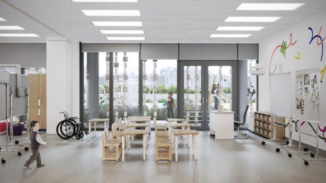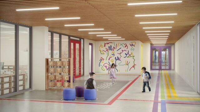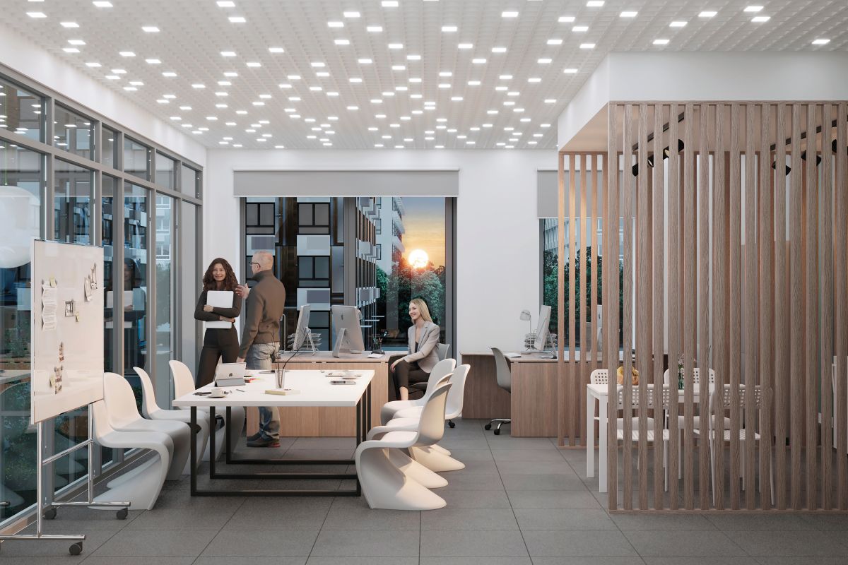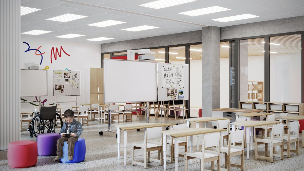 Также акцент сделан на пространстве для учителей — OPEN SPACE с видом на атриум. Здесь разработана зона коворкинга с кухней. Пространство разделено по функциям за счет реечного деления и разных групп осветительных приборов.