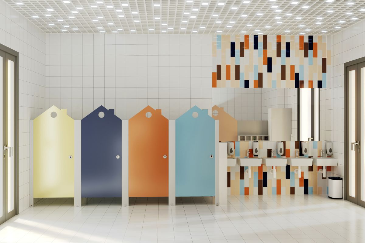 Санузлы достигают максимум эффекта за счет минимальных средств. Белая фоновая плитка, плитка-кабанчик в цветах проекта в зоне раковин и сантехнические перегородки в форме домиков — как основной элемент дизайна в туалетах.