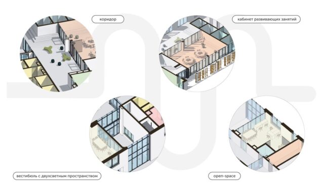 На всех этапах проектирования активно использовались схемы Revit для демонстрации Заказчику заложенных идей. Они помогли в детальном представлении концепции и в понимании ее реализации.