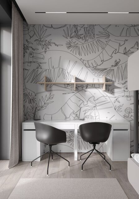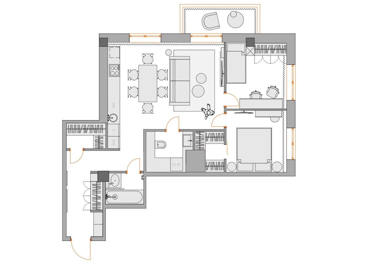 Изначальная планировка квартиры включала в себя 2 жилые комнаты. Моя задача организовать пространство эргономично и разделить его на спальню, детскую и кухню-гостиную. Продумать большое количество закрытых мест хранения, раздельный санузел и постирочную зону, детально спланировать пространство кухни, так как Заказчица любит готовить и принимать гостей.