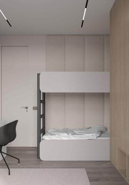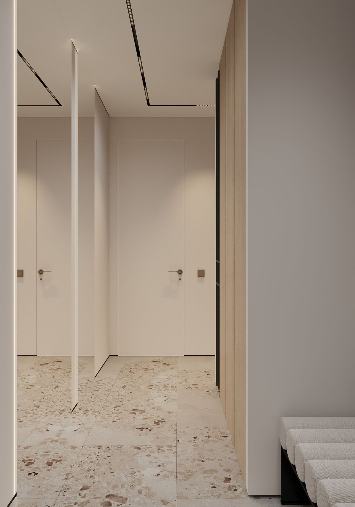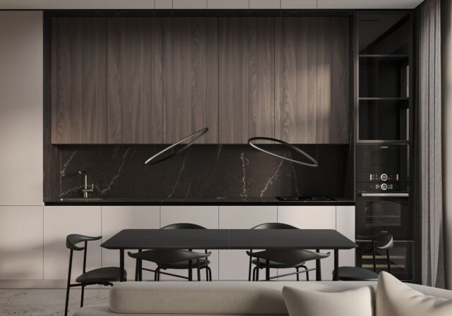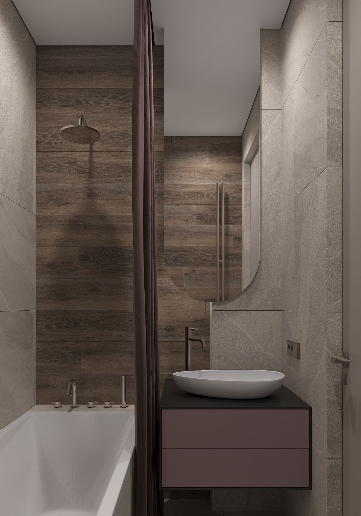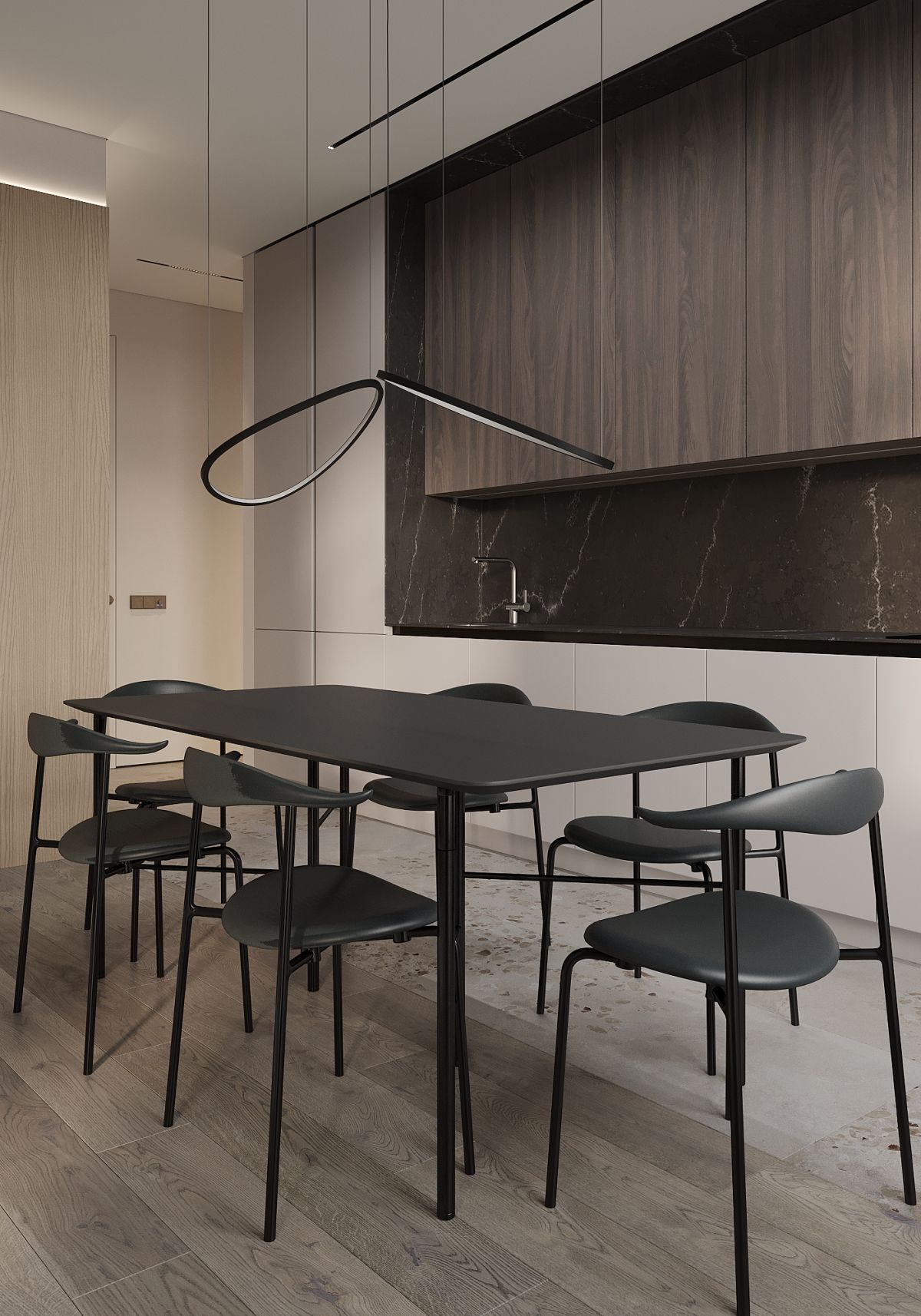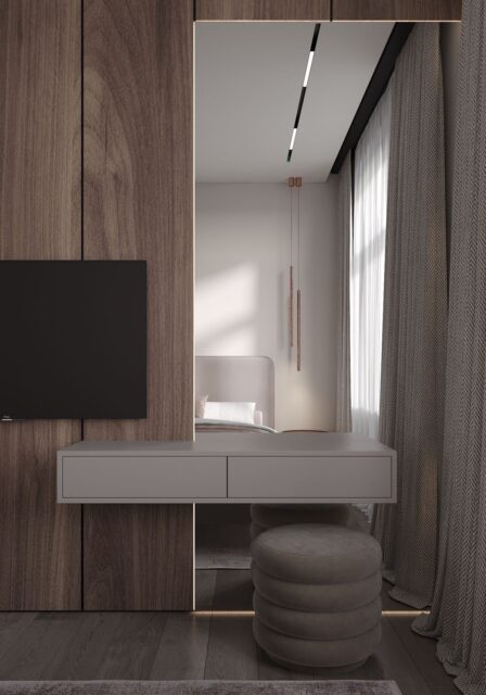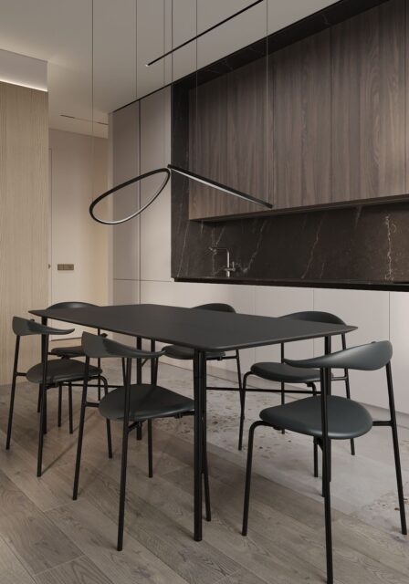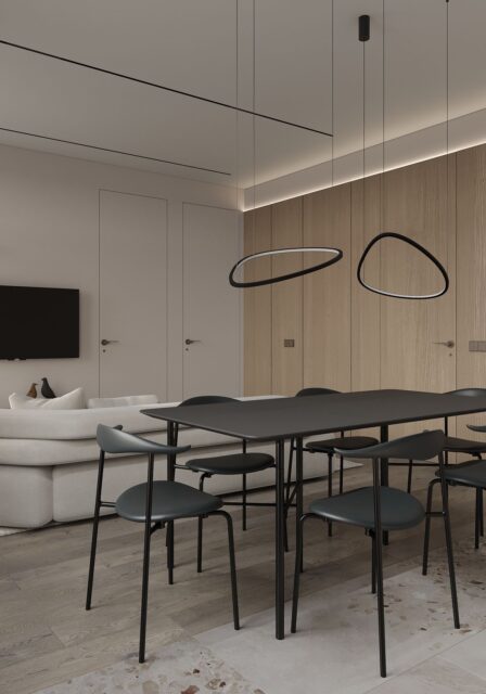 Так появился проект EXHALE. Основной цвет всего пространства светло серый с лиловым оттенком. Он является нейтральным фоном для сложного цвета паркета и активной плитки тераццо. Скрытые двери в цвет стен не стандартной высоты визуально подчеркивают и поднимают высоту помещения. В небольшом пространстве появляется воздух. Для такого же эффекта спроектирована встроенная мебель, без лишних деталей – шкафы, шпоновые панели, кухня. Черная матовая мебель, оконные откосы из черного шпона, тонкие тросы в зоне ТВ, лаконичные ножки обеденной группы выделяются на фоне светлых оттенков, но в тоже время не перегружают интерьер за счет своей современности и легкости. Часть гостиной комнаты забрала масштабная стена, которую я намеренно выделила не только панелями из шпона осветленного дуба, а также подсветкой в едином уровне межкомнатных дверей. В спальне и ванной комнате, помимо темного дерева, добавила сложно розовые оттенки, делая интерьер более камерным.