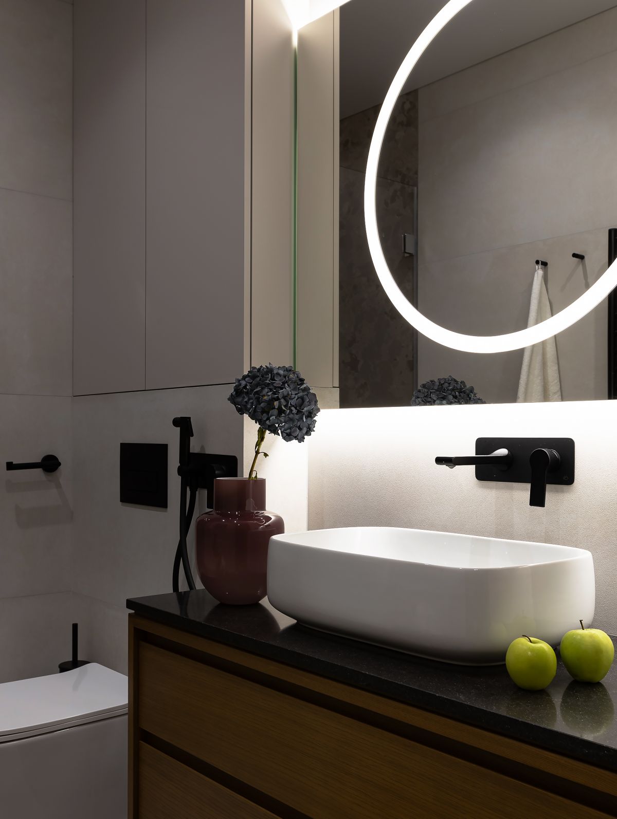 В гостевом санузле, яркие бабушкины яблоки не дают нам забыть о любимом хуторе. А в хозяйской ванне, ветка ели помогает расслабиться и полностью перезагрузится, после тяжелого рабочего дня.