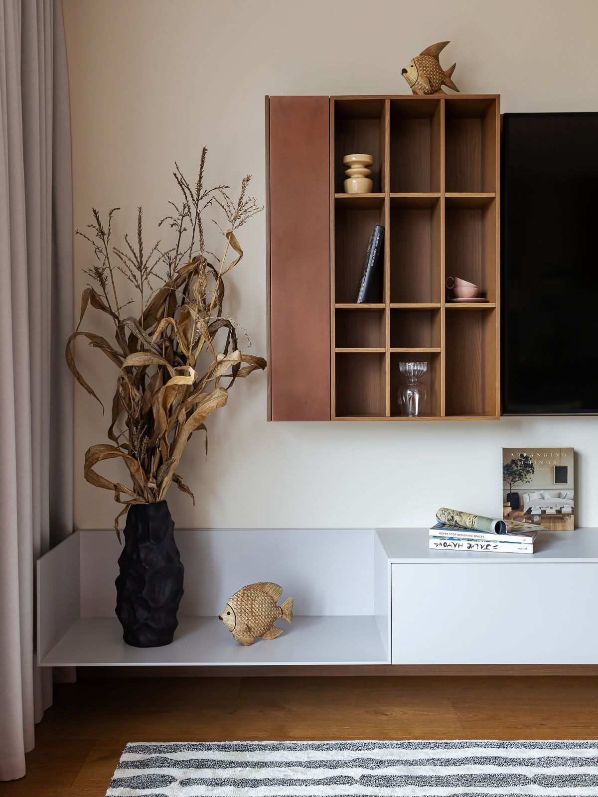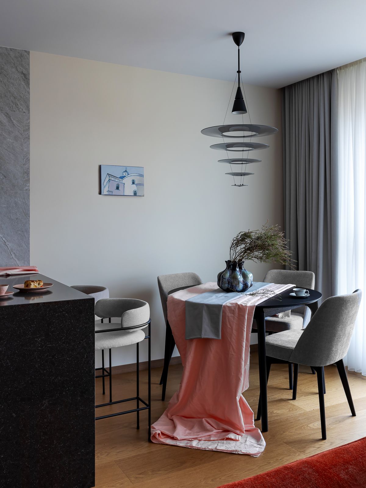 В самой главной и большой комнате квартиры — кухне-гостиной, мы постарались сохранить ту гармонию, которая была создана дизайнером, и даже добавить, некого сельского уюта, многослойным и немного помятым текстилем. Также мы добавили небольшую картину, чтобы все внимание приковывалось к столу и люстре над ним. В зоне гостиной, сельский колорит поддерживается большими букетами из сухих стеблей кукурузы и фактурными деревянными рыбками, которые придают интерьеру динамику.
