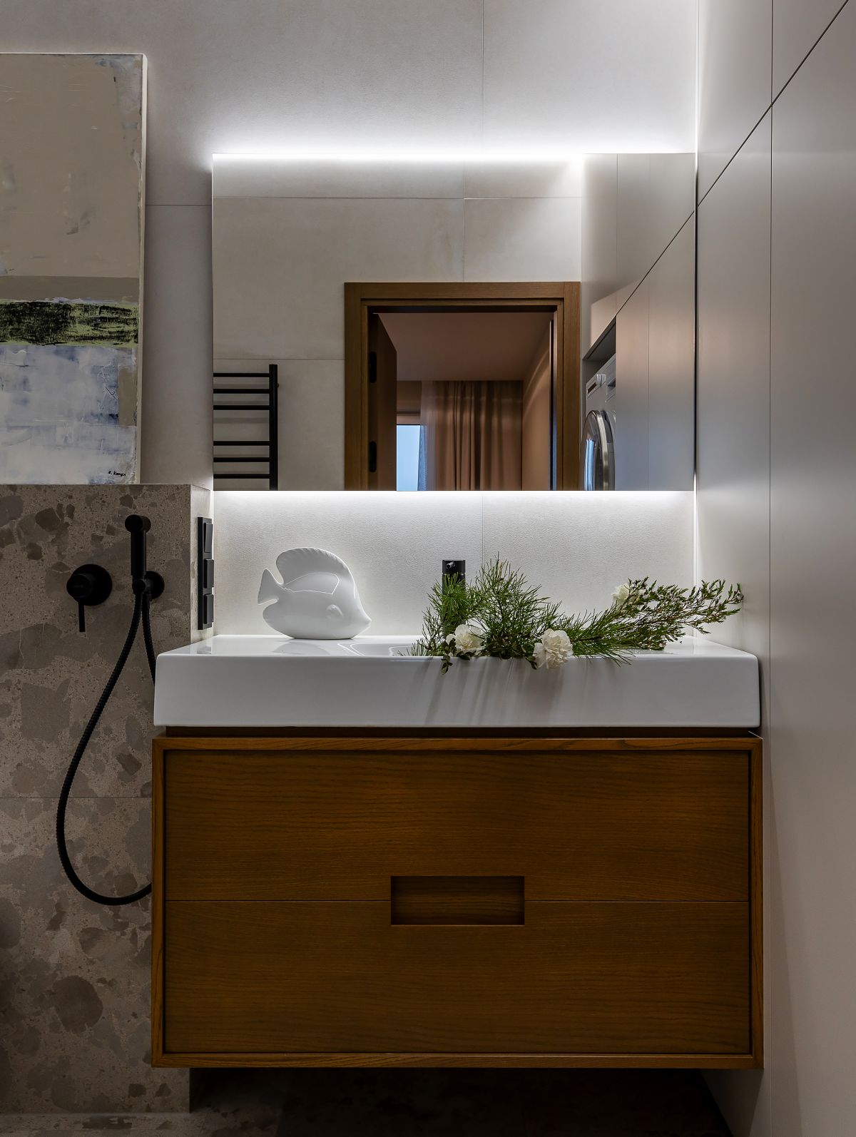 Но нам захотелось добавить характер этому пространству. Поэтому при входе мы разместили картину «Joke» Радаславы Моцко, которая вызывает яркие эмоции. Но благодаря сочетанию деревянных элементов, книг и зелени, сохраняется атмосфера спокойствия.