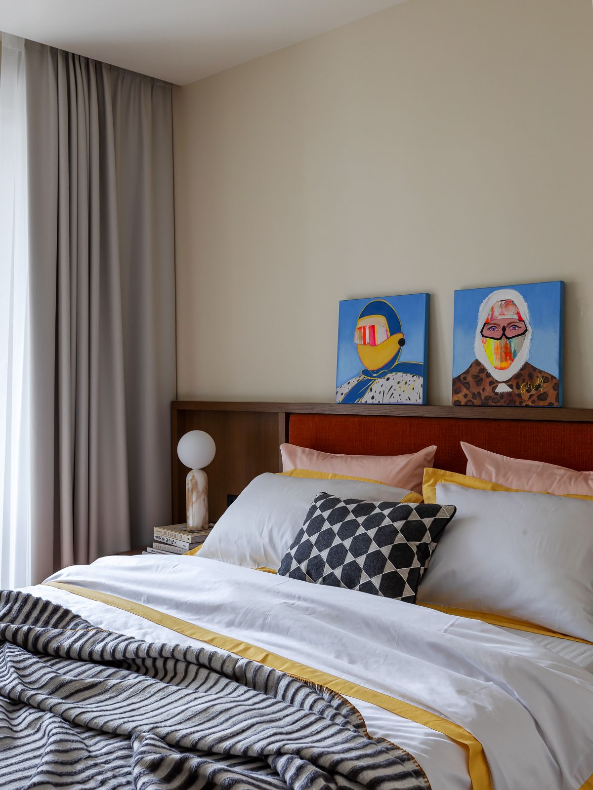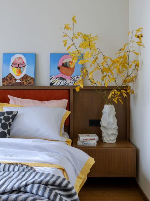 Название картины «Загляне сонца і ў наша аконца» Радаславы Мацко идеально отражает концепцию спальни, в которой мы стремились создать атмосферу теплого летнего дня в любое время года. Яркий желтый цвет никого не оставит равнодушным и окутает своим теплом, даже в самый хмурый день.