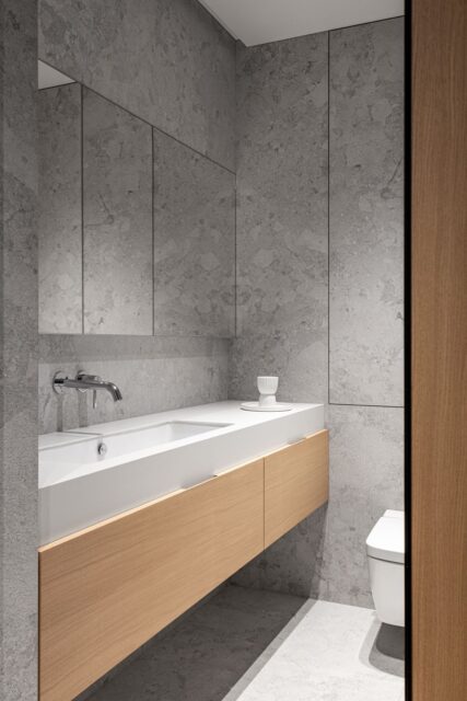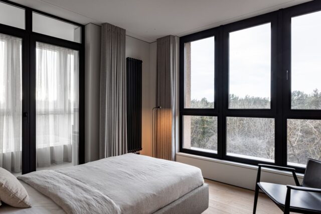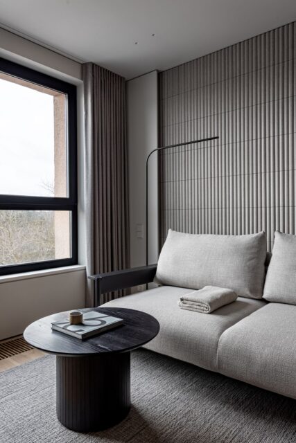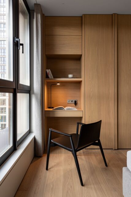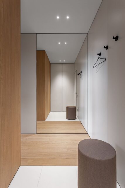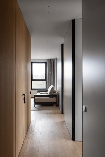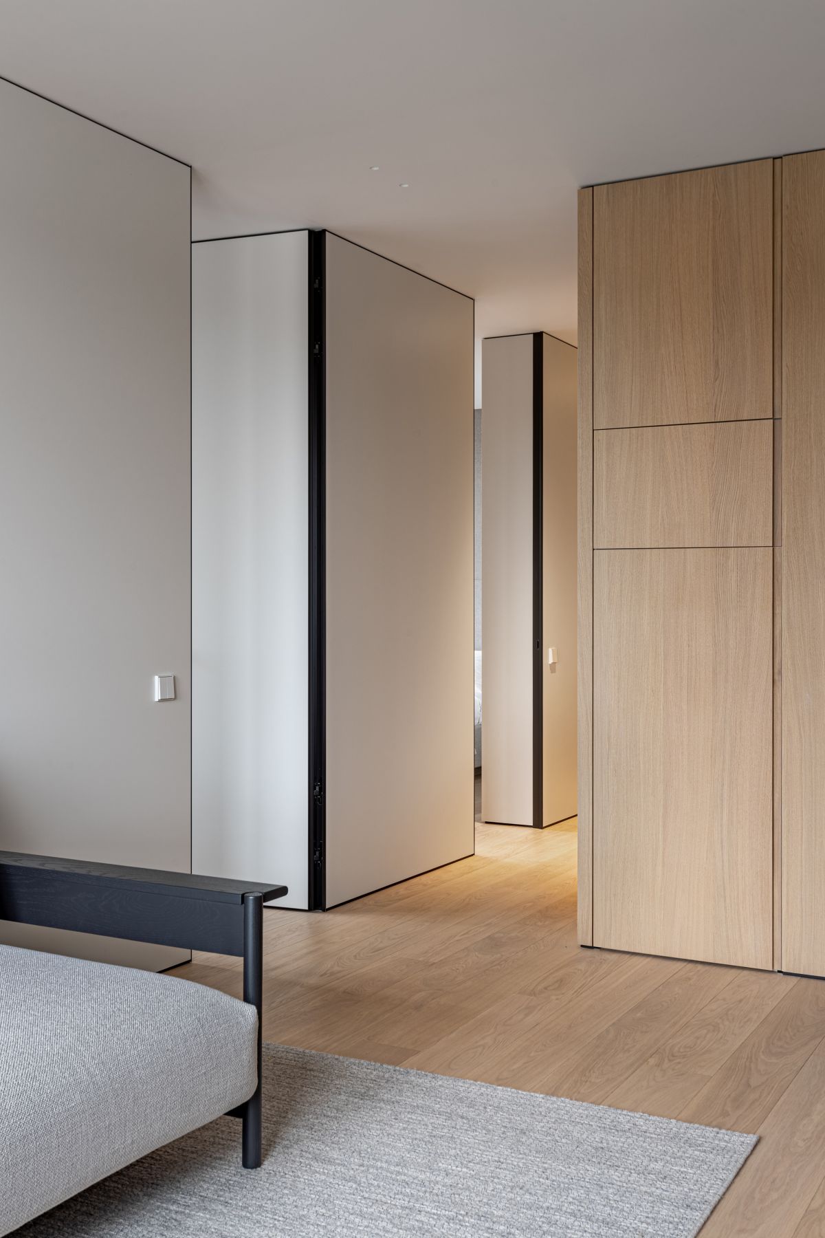Характерной отличительной чертой интерьера является использование дверей скрытого монтажа во всю высоту помещения без верхних перемычек. Это позволяет создать единую неразрывную плоскость потолка во всех помещениях квартиры. Дополнительную графичность добавляют черные теневые зазоры вверху и внизу стены.