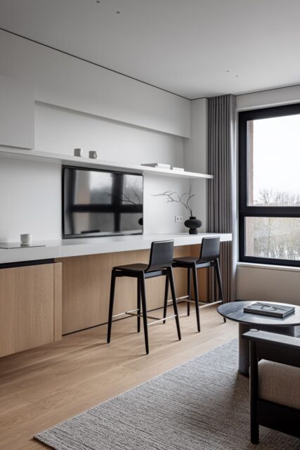 Основная задача для команды дизайнеров со стороны заказчиков была поставлена следующим образом: спроектировать “чистый” минималистичный интерьер с использованием натуральных материалов и вниманием к деталям. Интерьер должен олицетворять собой гармонию и единение с природой за окном.