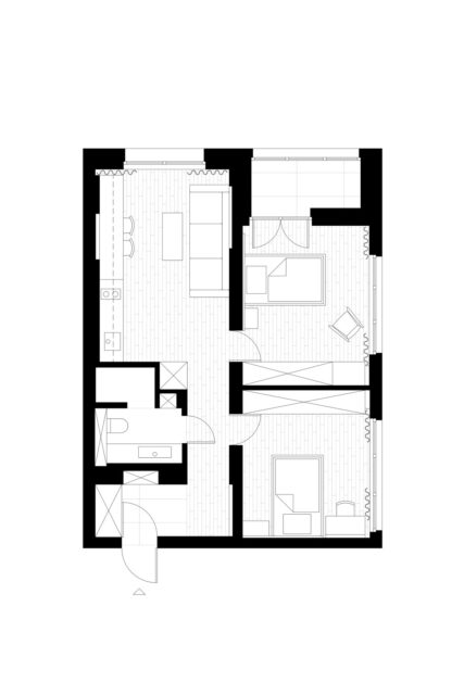 Интерьер разрабатывался для семейной пары. После перепланировки сформировался следующий состав помещений: прихожая, кухня-гостиная, душевая комната, лоджия, две спальни (мужская и женская).