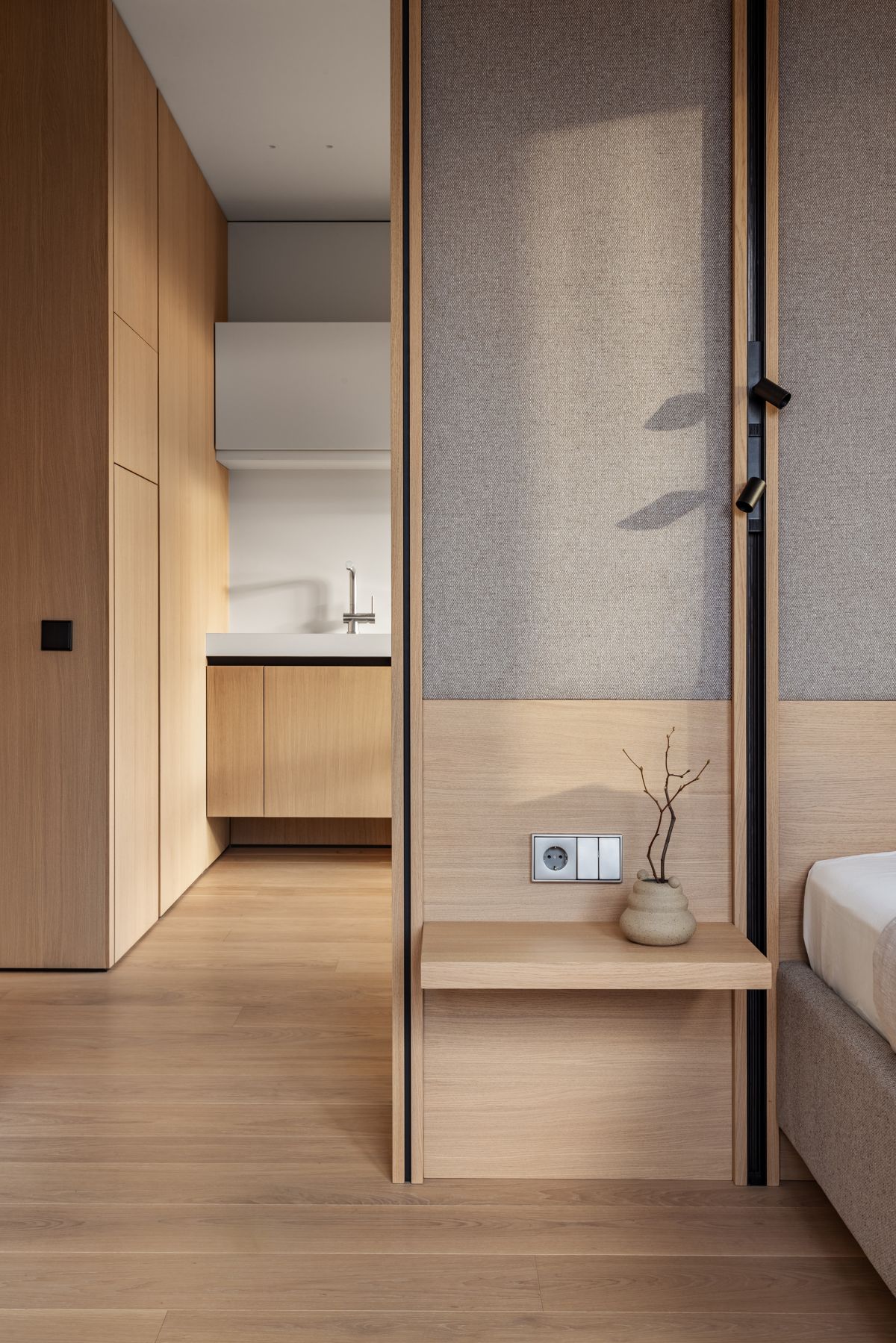 Пространство квартиры выдержано в единой цветовой гамме: слегка выбеленный оттенок натурального дуба (паркетная доска, шпонированные стеновые панели и фасады корпусной мебели с лаконичным радиальным характером расположения волокон), светлый, практически белый тон стен и потолка (покраска, МДФ панели), серо-бежевый текстиль (мягкая мебель, тканевые стеновые панели, портьеры) и черные акцентные элементы. Также серо-бежевый тон повторяется в крупноформатном керамограните душевой комнаты. Для придания визуальной целостности он смонтирован не только на стены и пол, но и на элементы корпусной мебели.
