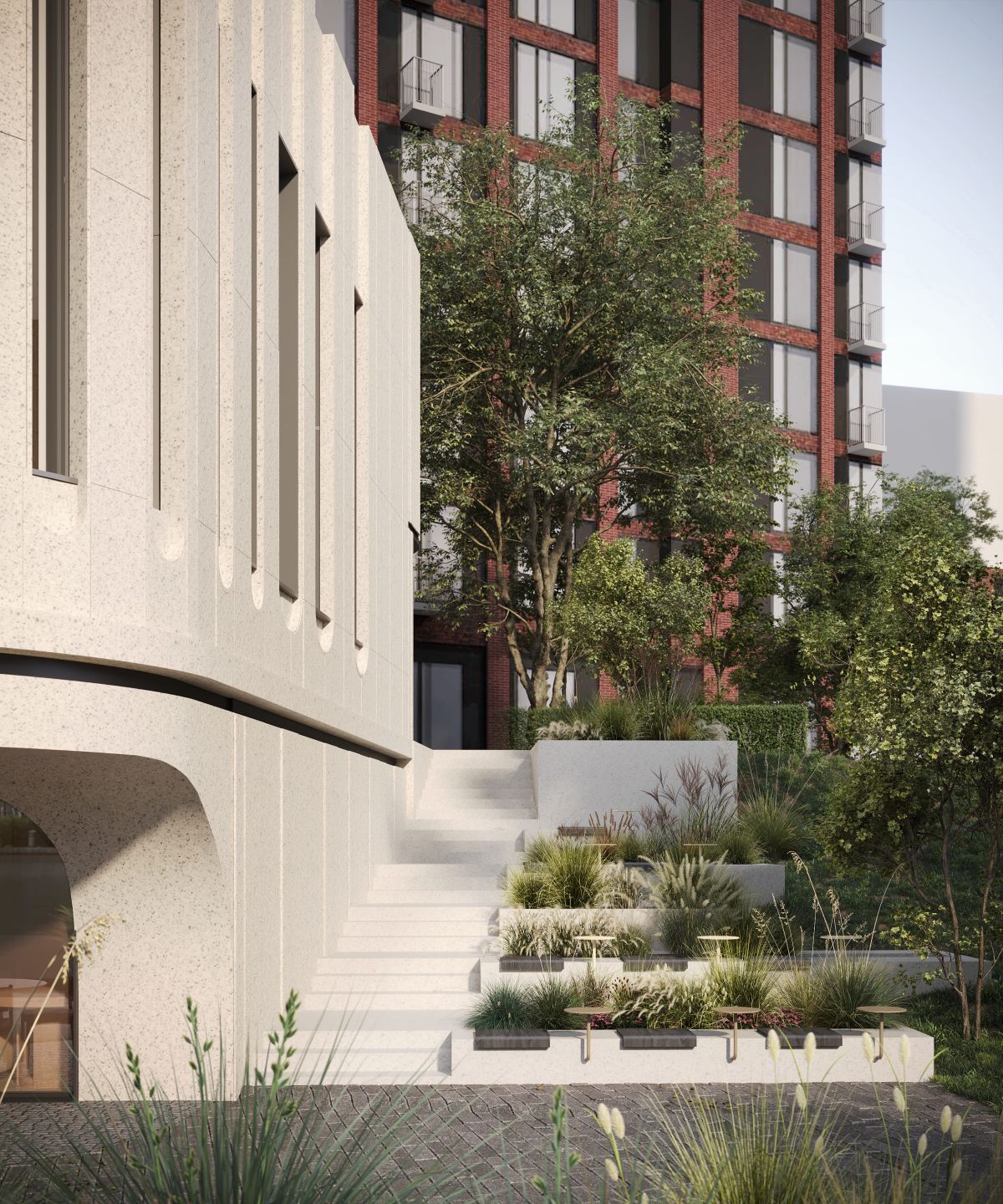 Лестница, спроектированная сбоку от здания, выполняет несколько функций: она соединяет жилую застройку с набережной, служит зоной отдыха и интегрирована в летнюю веранду ресторана. Встроенные каскадные клумбы создают уединенное пространство и визуально связывают его с озеленением набережной.