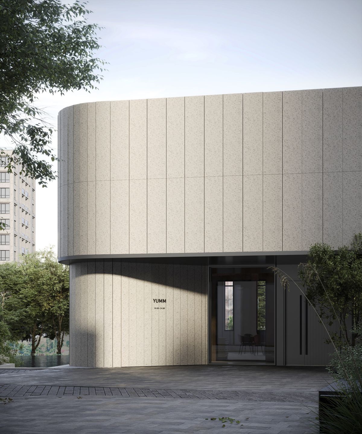 Жилые здания квартала выдержаны в строгих и лаконичных формах, и ресторан поддерживает этот стиль. Со стороны водоема фасад раскрывается динамичным ритмом остекления, дополненным выступающими декоративными элементами, которые сохраняют баланс между структурной четкостью и легкостью восприятия.