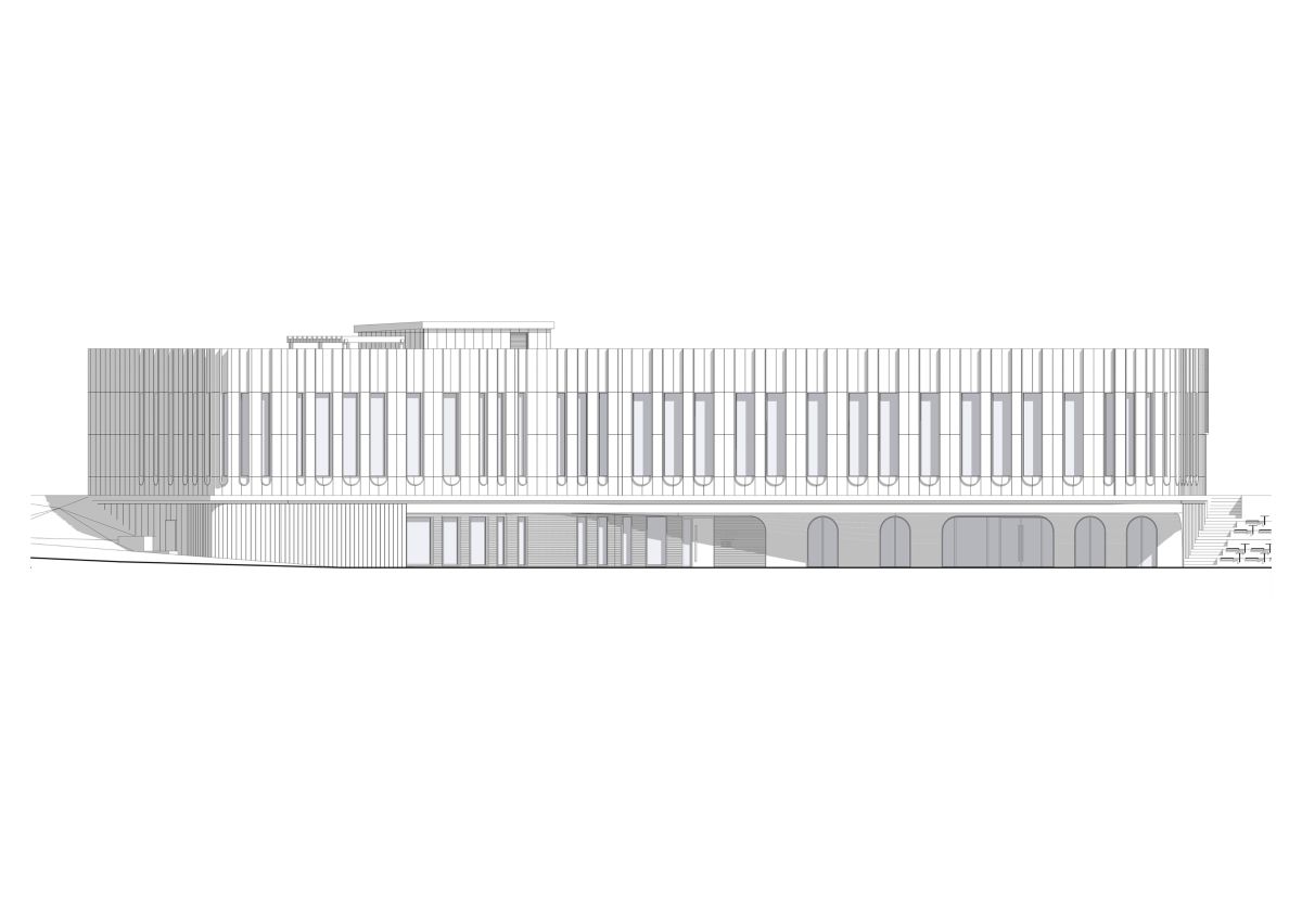 Проектируемый ресторан расположен на набережной развивающегося жилого квартала, гармонично дополняя его архитектурную среду. Вдохновляясь окружающей застройкой, мы выделили ключевой архитектурный мотив квартала — арки, которые повторяются во многих общественных зданиях. Этот прием нашел отражение в проемах первого этажа и декоративной отделке второго уровня, а плавный переход стены в навес придал фасаду пластичность и выразительность.