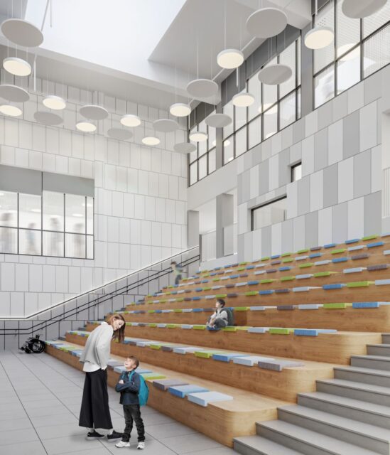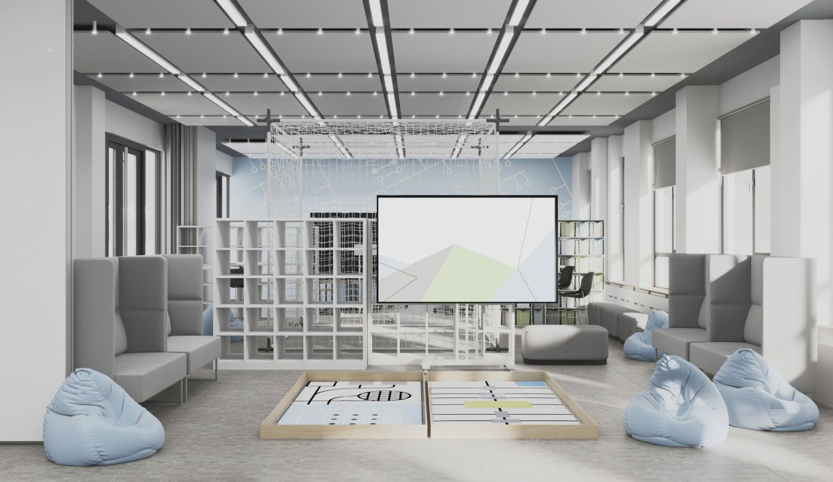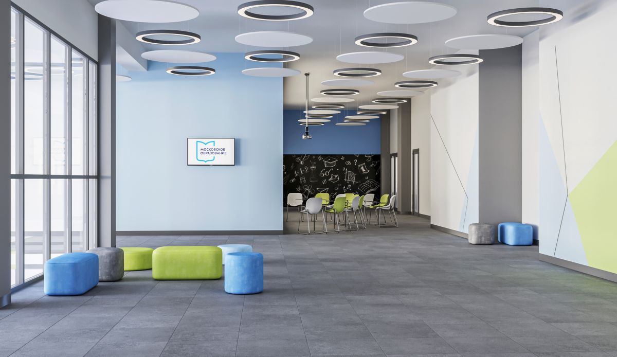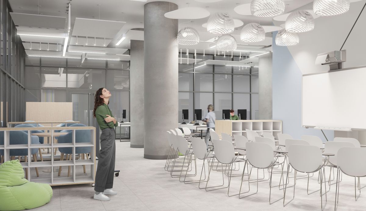 Основным акцентным пространством и зоной притяжения здания становится помещение многофункционального пространства. Оно представляет из себя атриум с амфитеатром, где учащиеся могут отдыхать, обучаться, устраивать культурно-массовые мероприятия, проводить свободное время. Зенитные фонари обеспечивают попадание естественного света в многофункциональное пространство, коридоры и зоны рекреации 4 этажа.