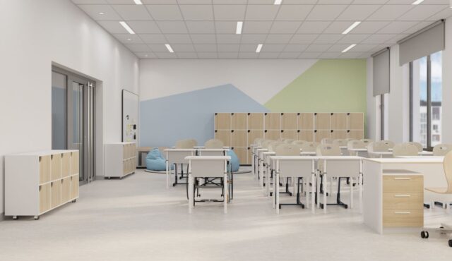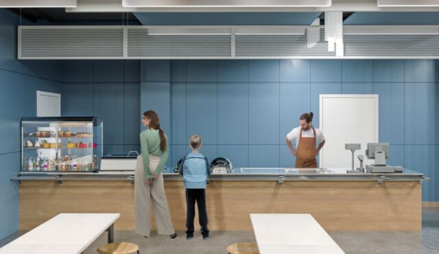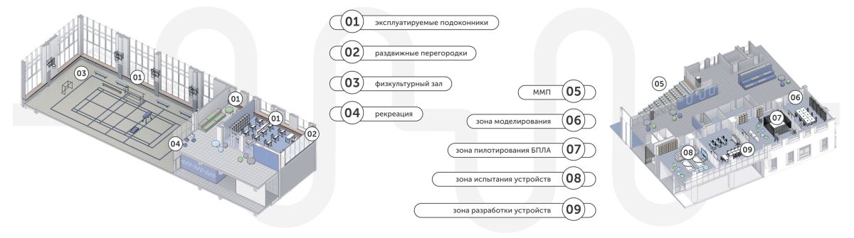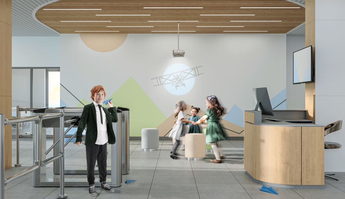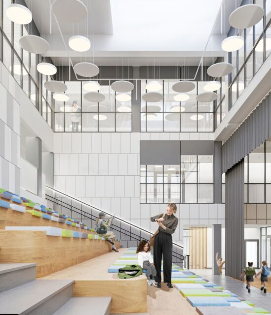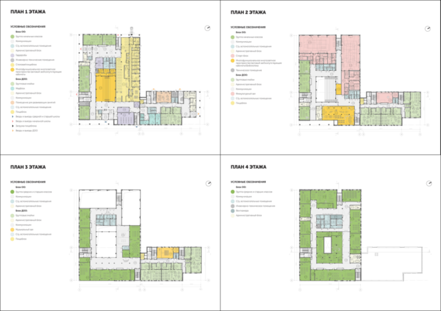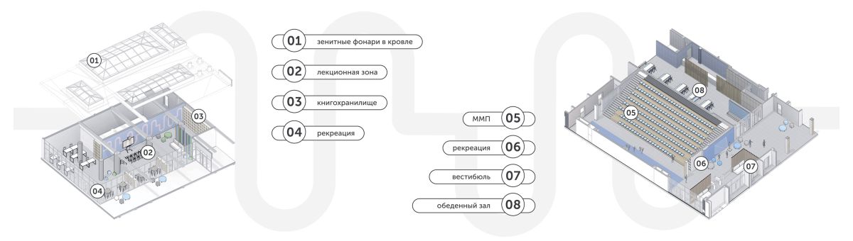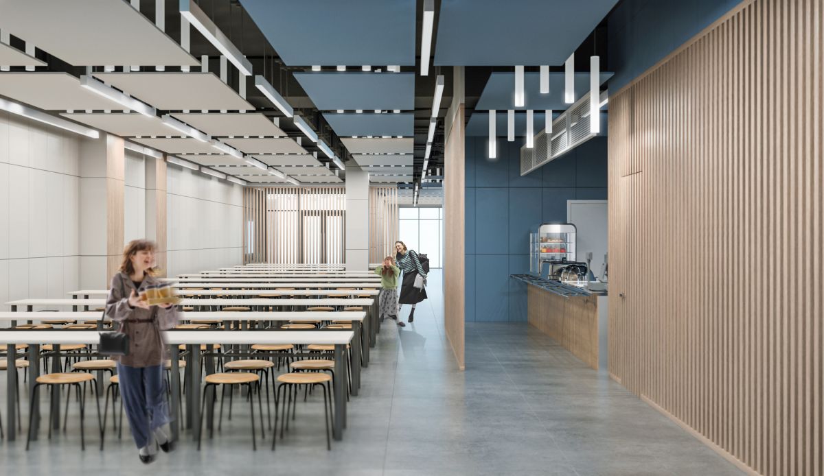 Основным акцентным пространством и зоной притяжения здания становится помещение многофункционального пространства. Оно представляет из себя атриум с амфитеатром, где учащиеся могут отдыхать, обучаться, устраивать культурно-массовые мероприятия, проводить свободное время. Зенитные фонари обеспечивают попадание естественного света в многофункциональное пространство, коридоры и зоны рекреации 4 этажа.