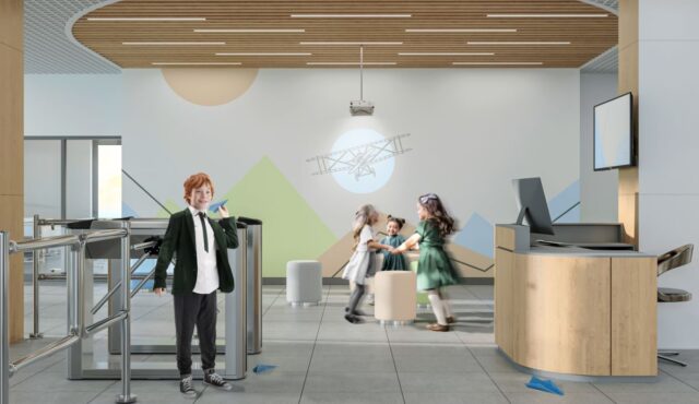 Проект образовательной организации включает в себя корпус дошкольного образования на 175 мест и общего образования на 400 мест. Оба корпуса объединены единой темой графики. Для данного проекта разработана минималистичных график на тему горного пейзажа, которая проста в нанесении с помощью трафарета.