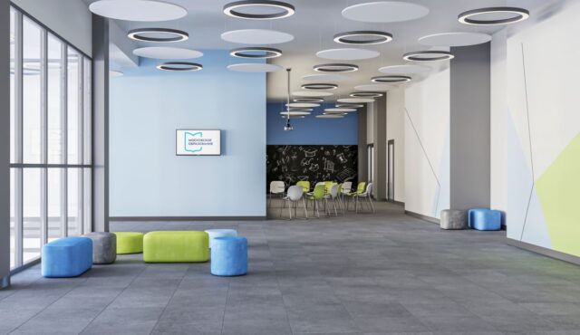 В дизайне здания использовано множество сценариев освещения. В общественных зонах и помещениях со специальными акустическими требованиями использованы акустические панели на подвесах, которые чередуются с осветительными приборами. Вместе они образуют разнообразные ритмические схемы и интересную композицию потолка.