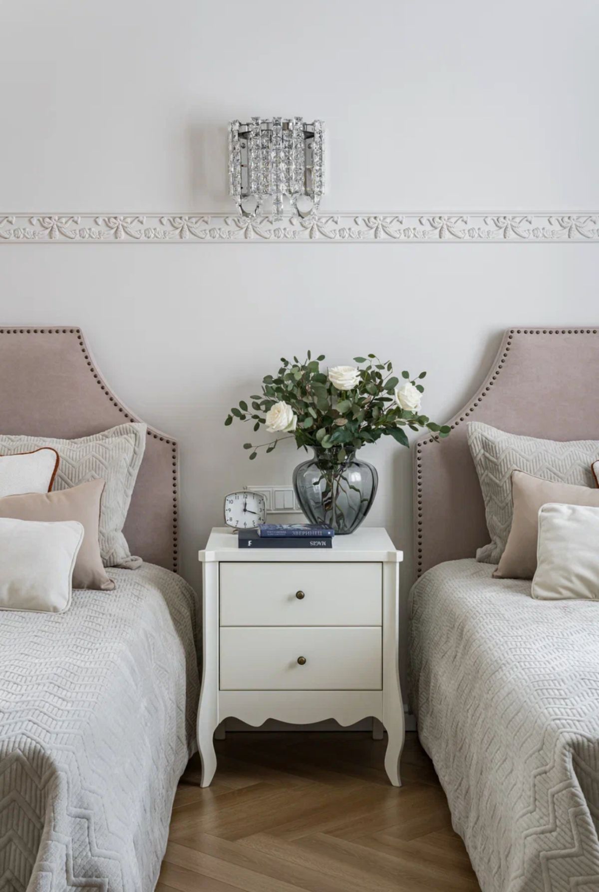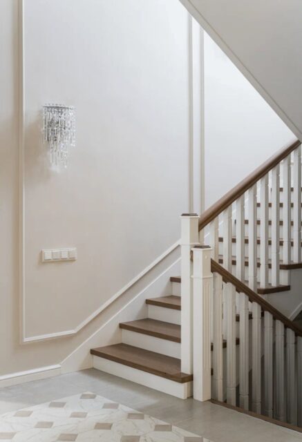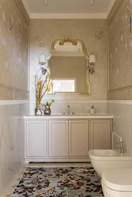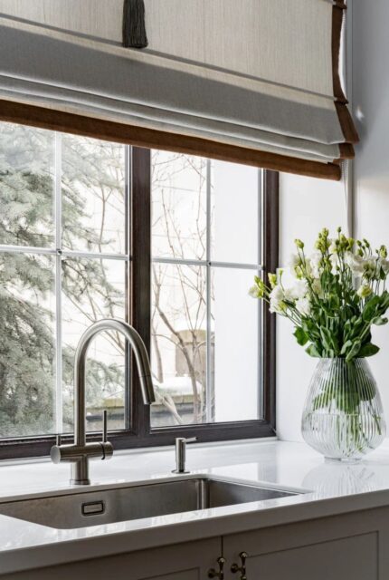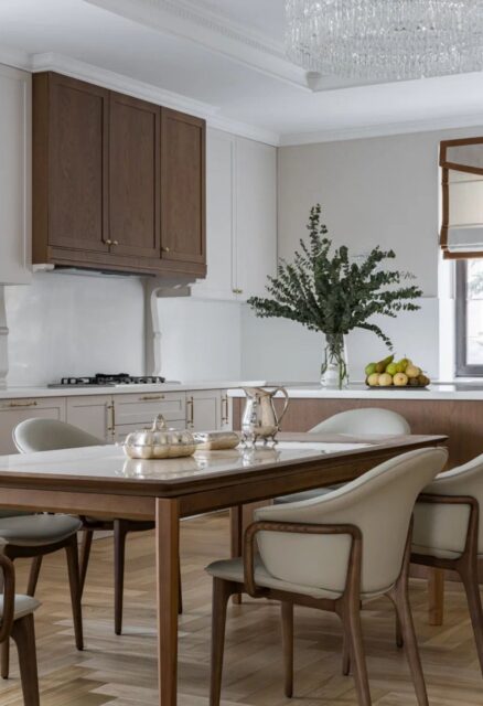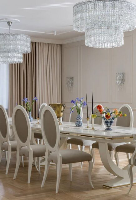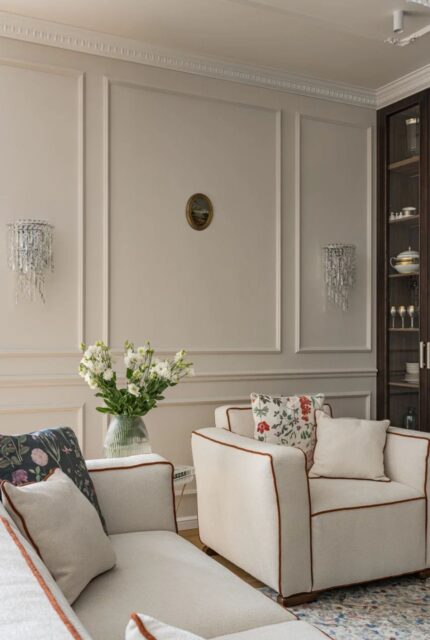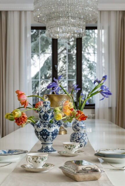 В цокольном этаже расположены котельная, прачечная, санузел, кинотеатр и гостевая комната. Интерьер мы старались сделать классическим и уютным, чтобы он отражал традиционные ценности семьи. Чтобы дети росли в интерьере, где спокойно, уютно и безопасно. Атмосфера весны, праздника, легкости — вот чего мы добивались. Даже кадры съемки получились такими романтичными.