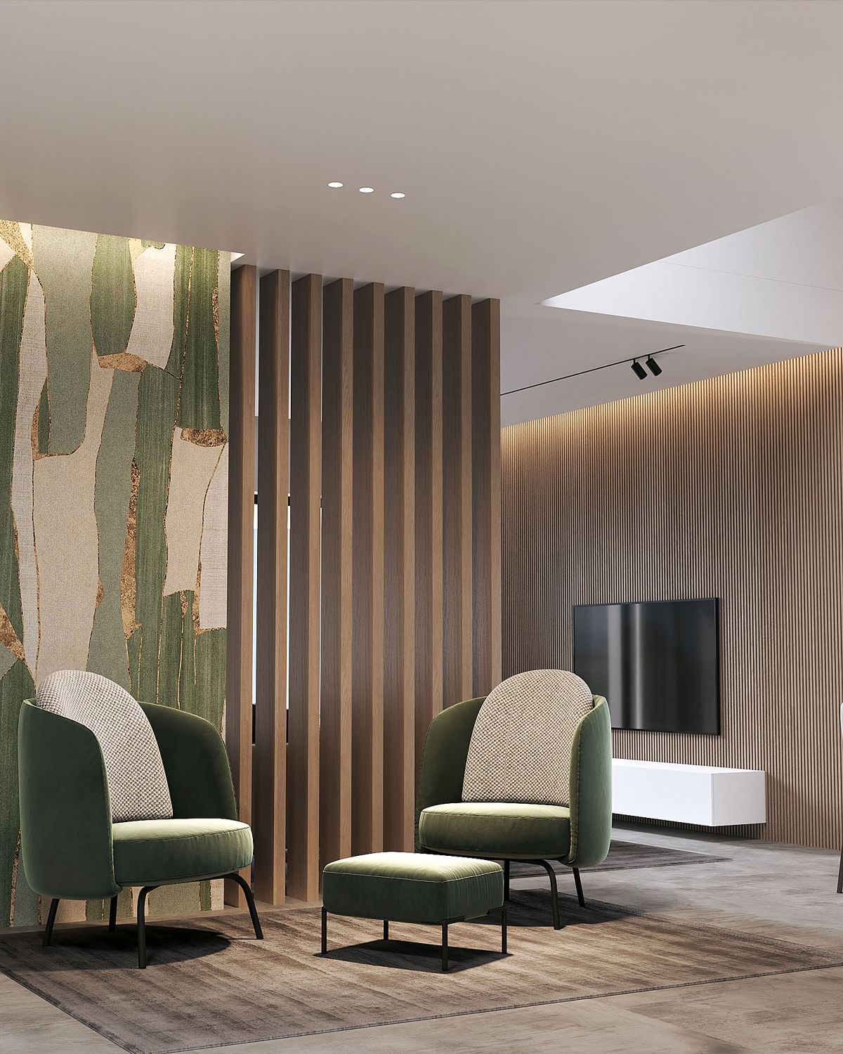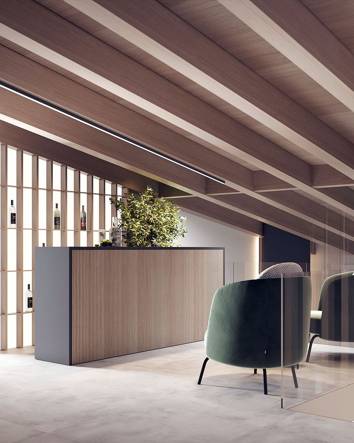 В основе проекта лежит использование натуральных материалов, таких как дерево, камень и речная галька, выбранных не только за их эстетичность, но и за их экологичность. Дерево является главным героем каждой комнаты, даря тепло и ощущение уюта. Камень и галька, отсылающие к чистоте природы, создают глубокую связь с ландшафтом Абруцци.