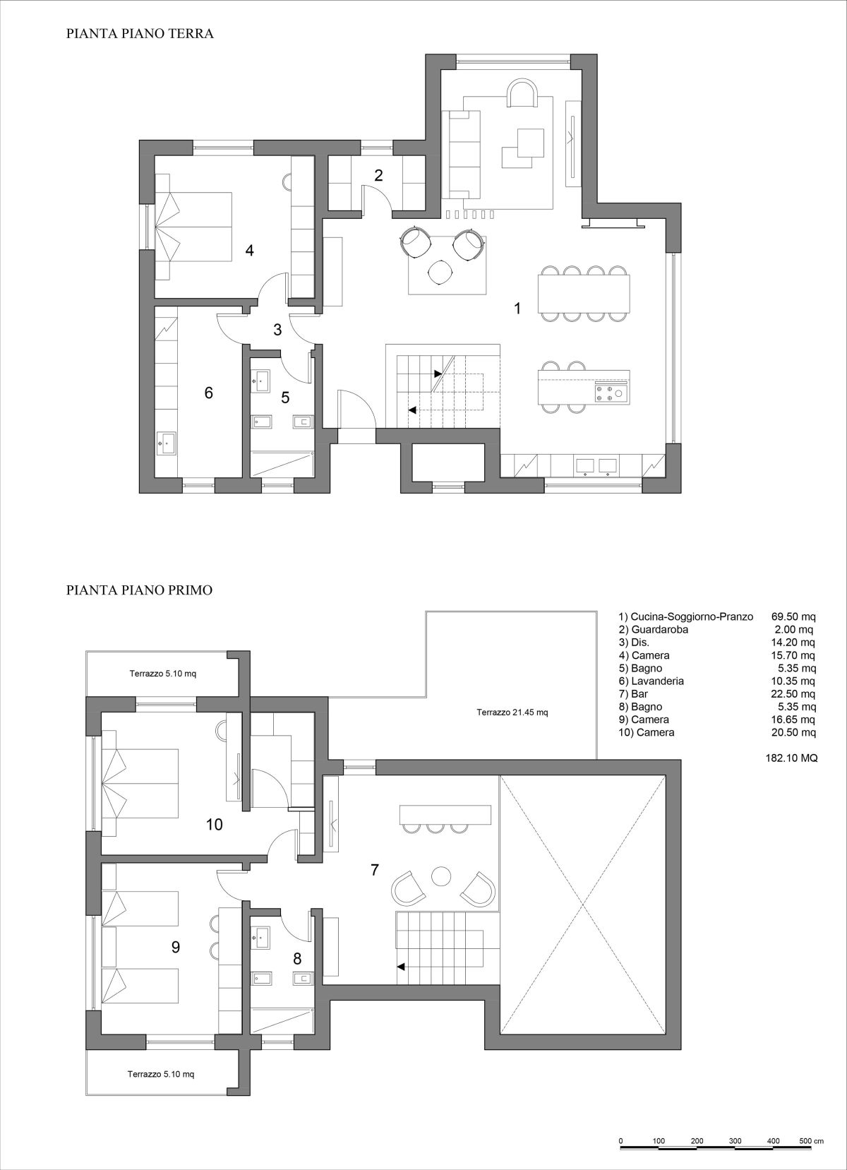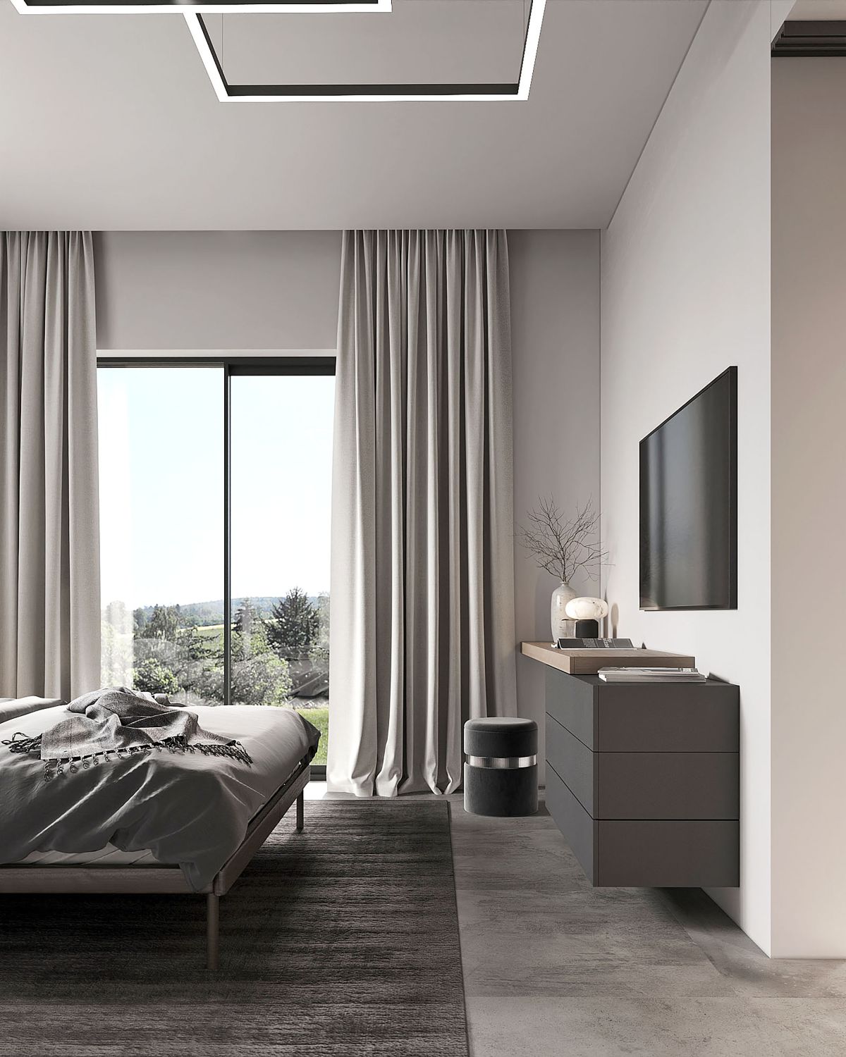 Второй этаж отведен под приватные помещения. Главная спальня, детская комната и главная ванная комната задуманы как места для уединения и благополучия. Каждая комната оборудована частной террасой, которая позволяет в полном спокойствии отдыхать на свежем воздухе, наслаждаясь захватывающим видом на холмы Абруццо.