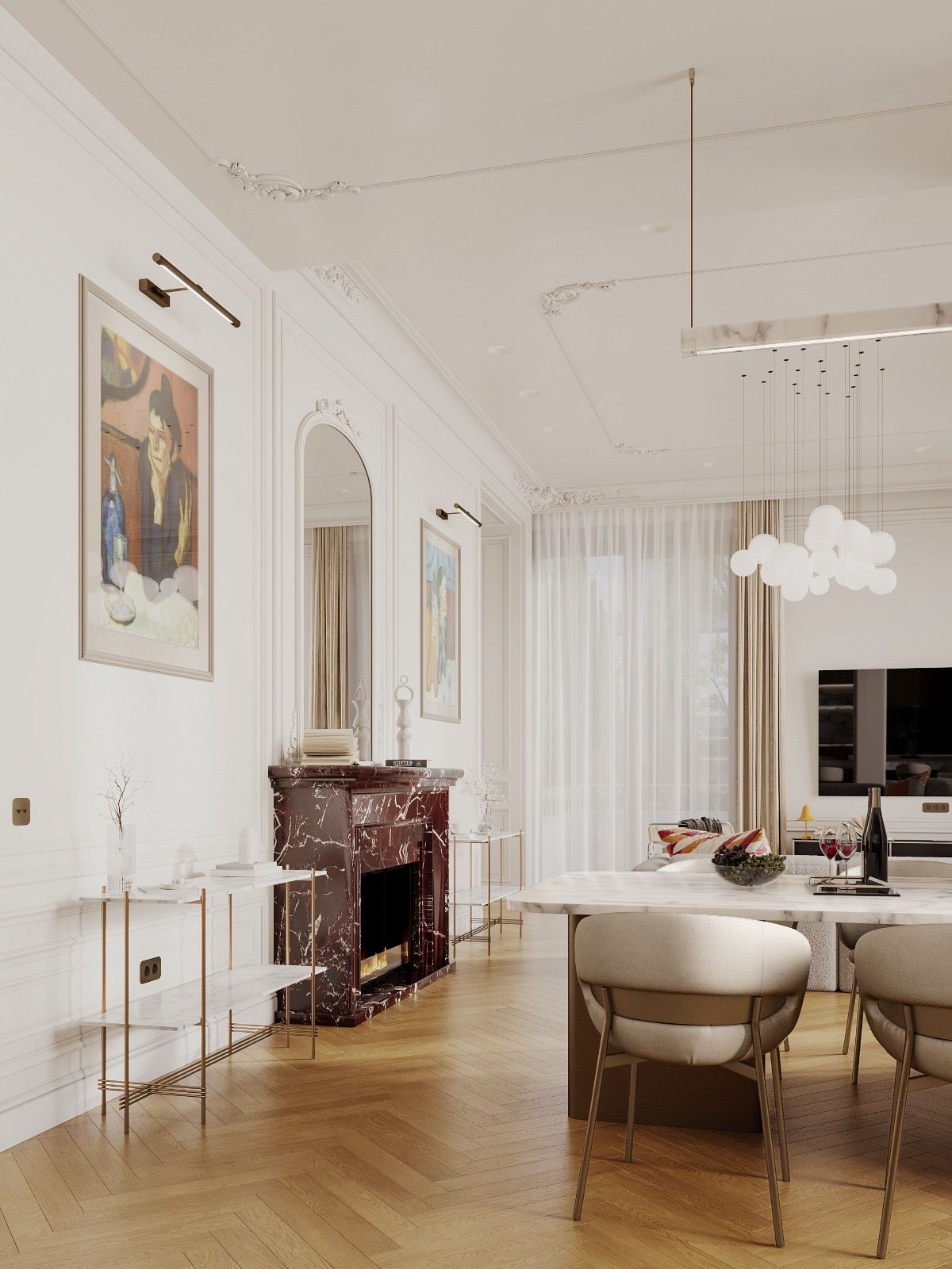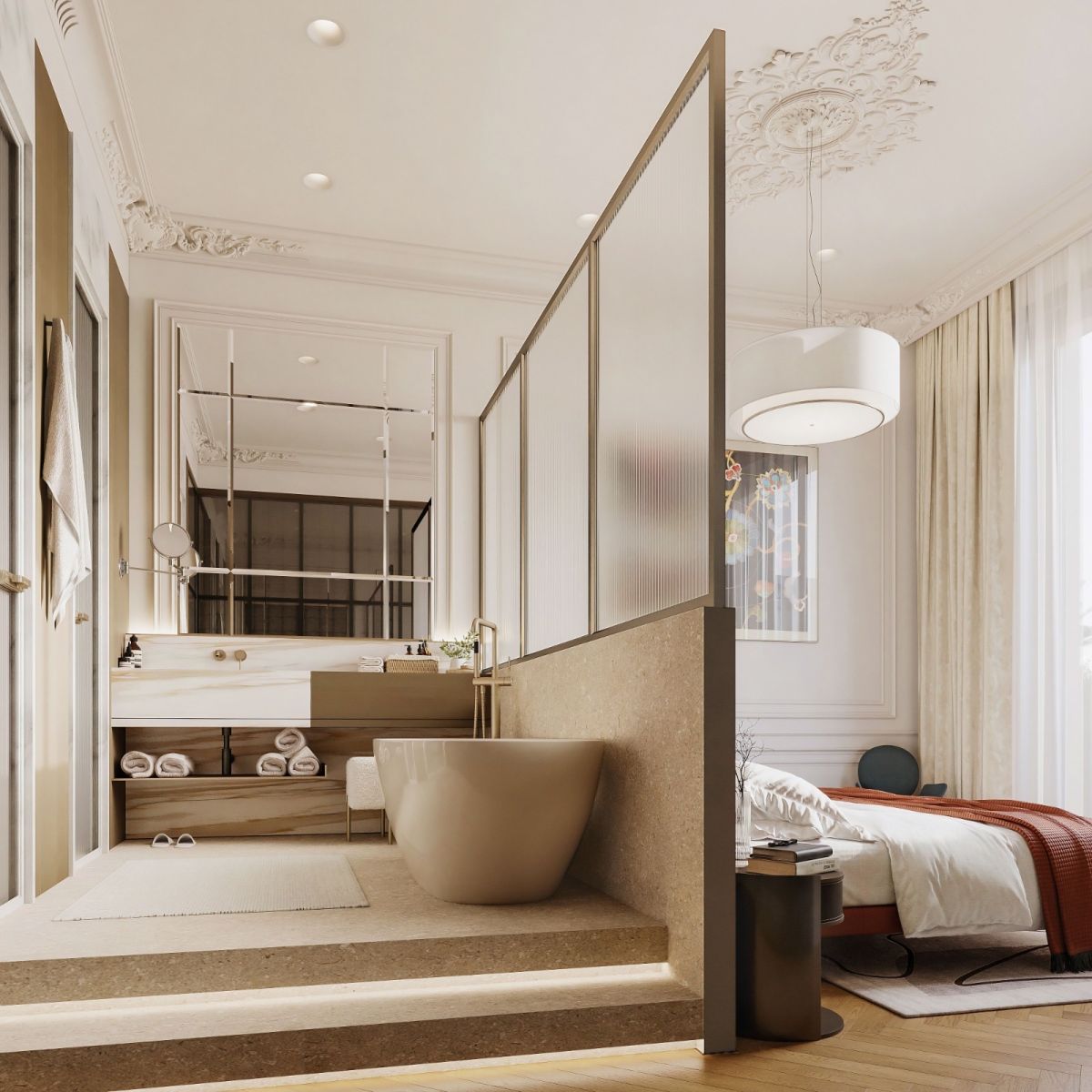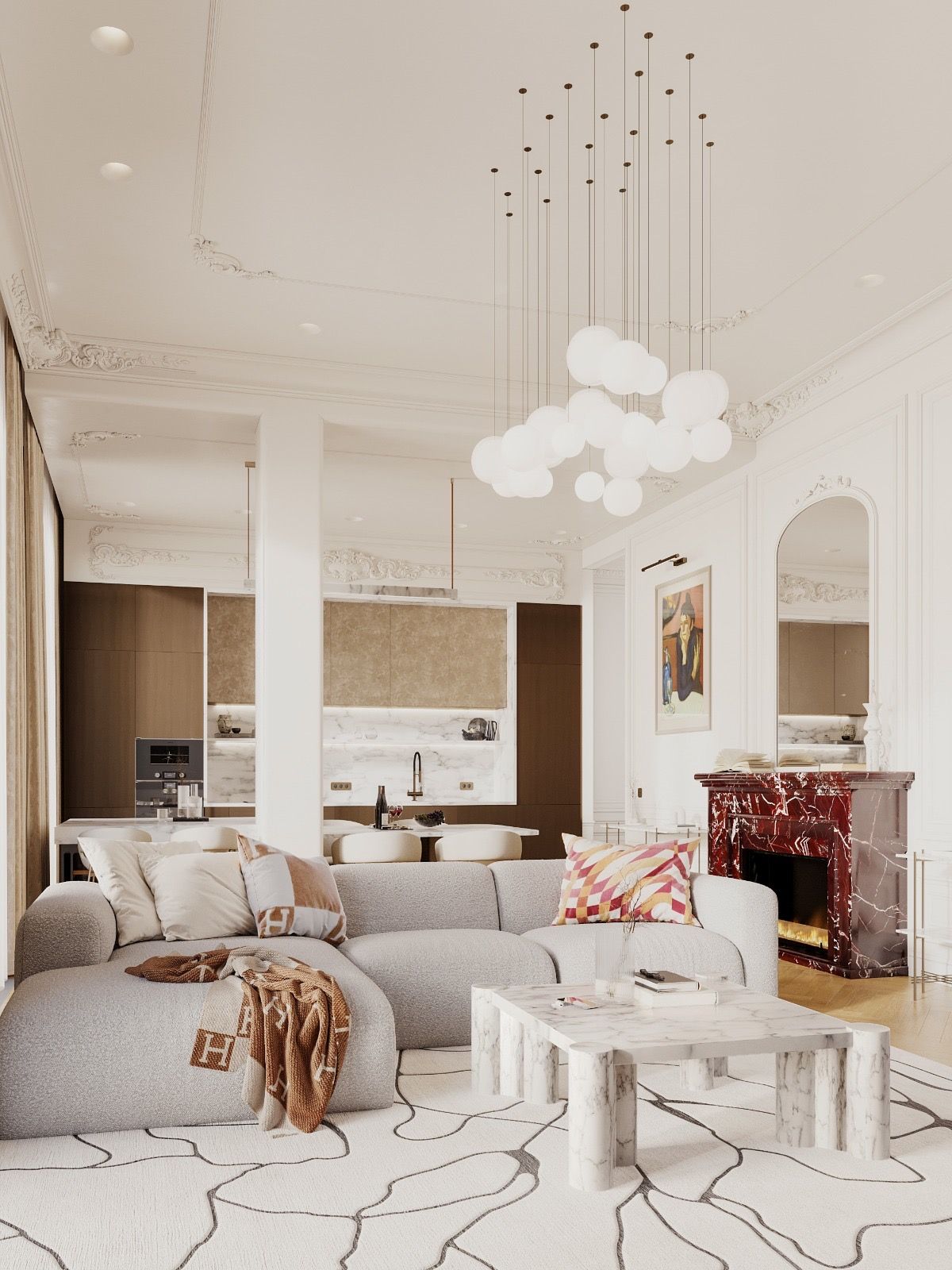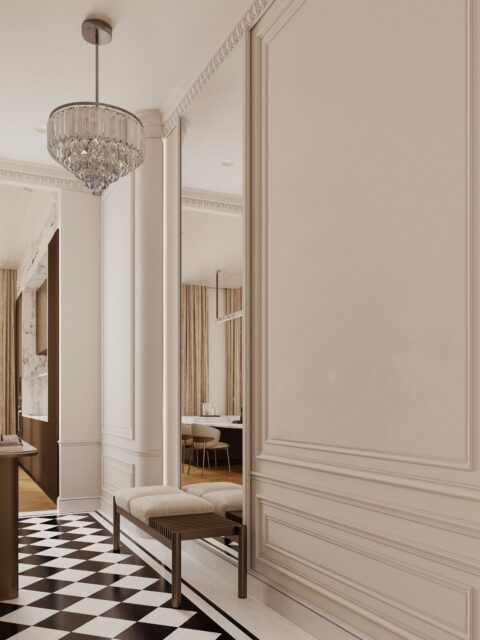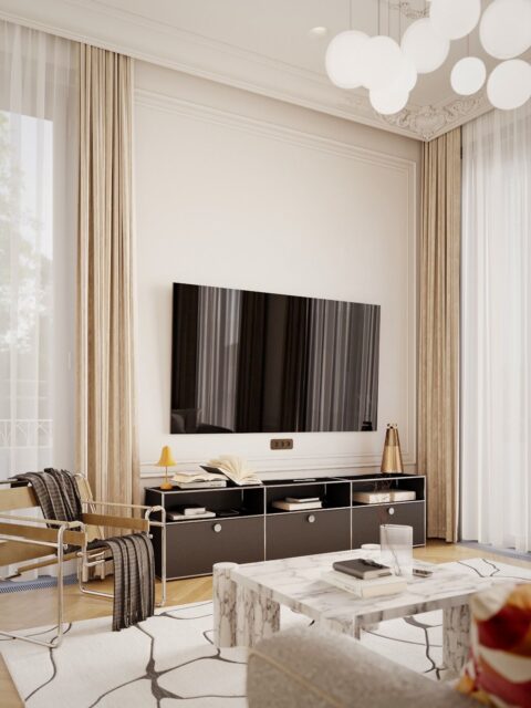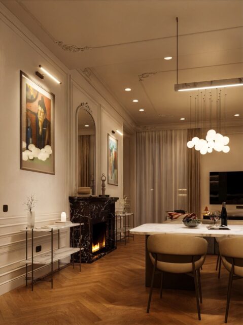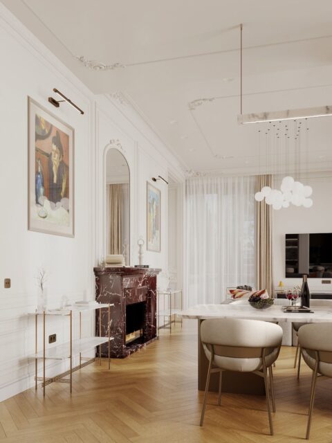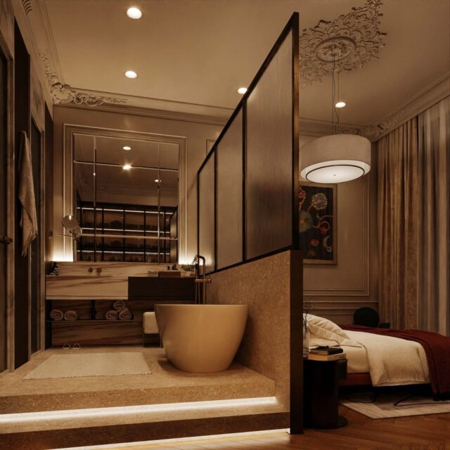 Кухня — зал студия, небольшая спальня с отдельностоящей ванной за кроватью. Интерьер задуман, как классический французский, с обильной лепниной на стенах и потолках, большим камином из красного мрамора, но с очень модным освещением и современной акцентной футуристичной мебелью.