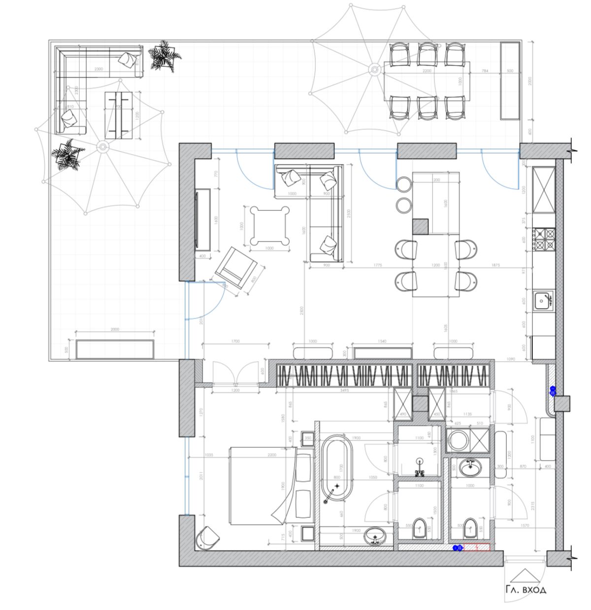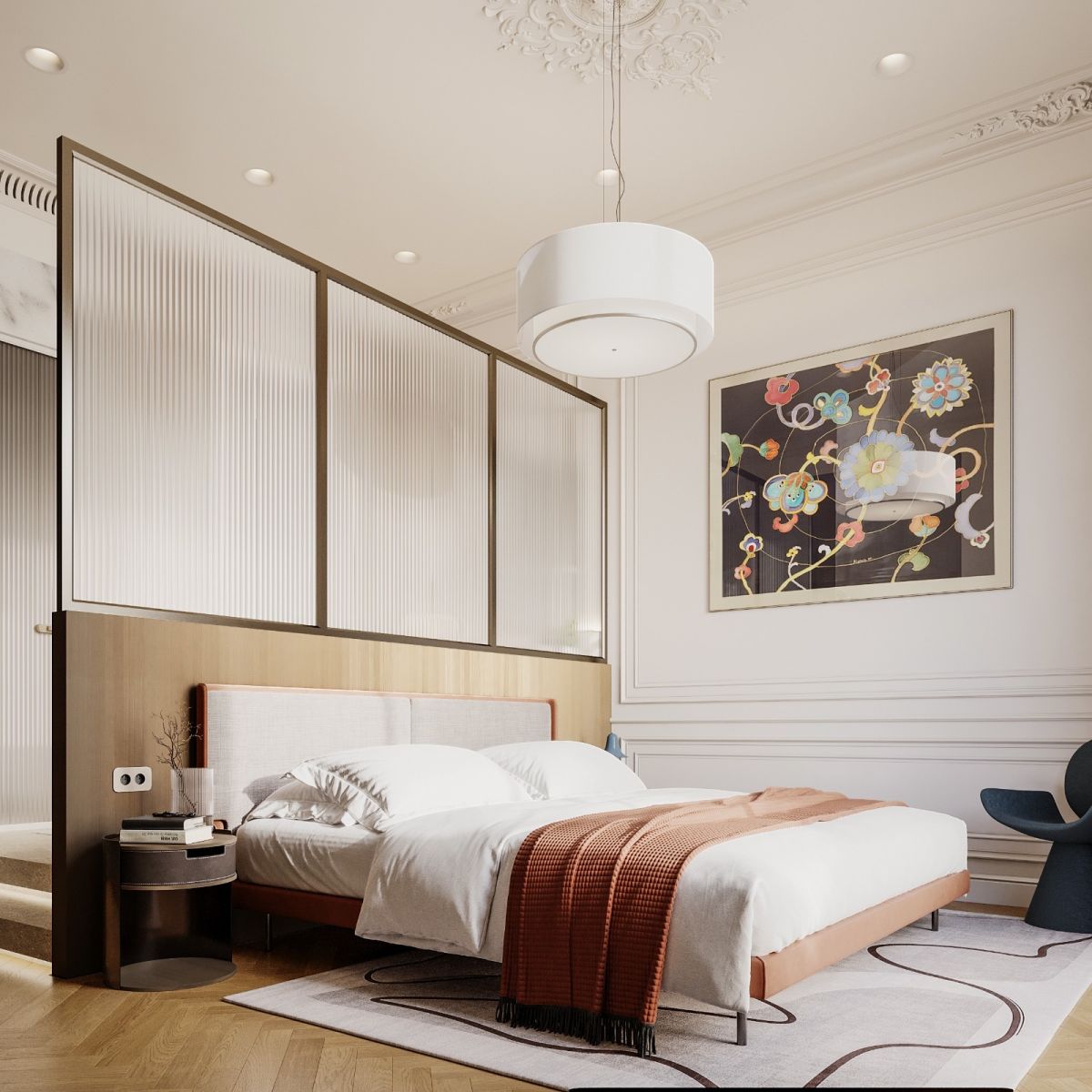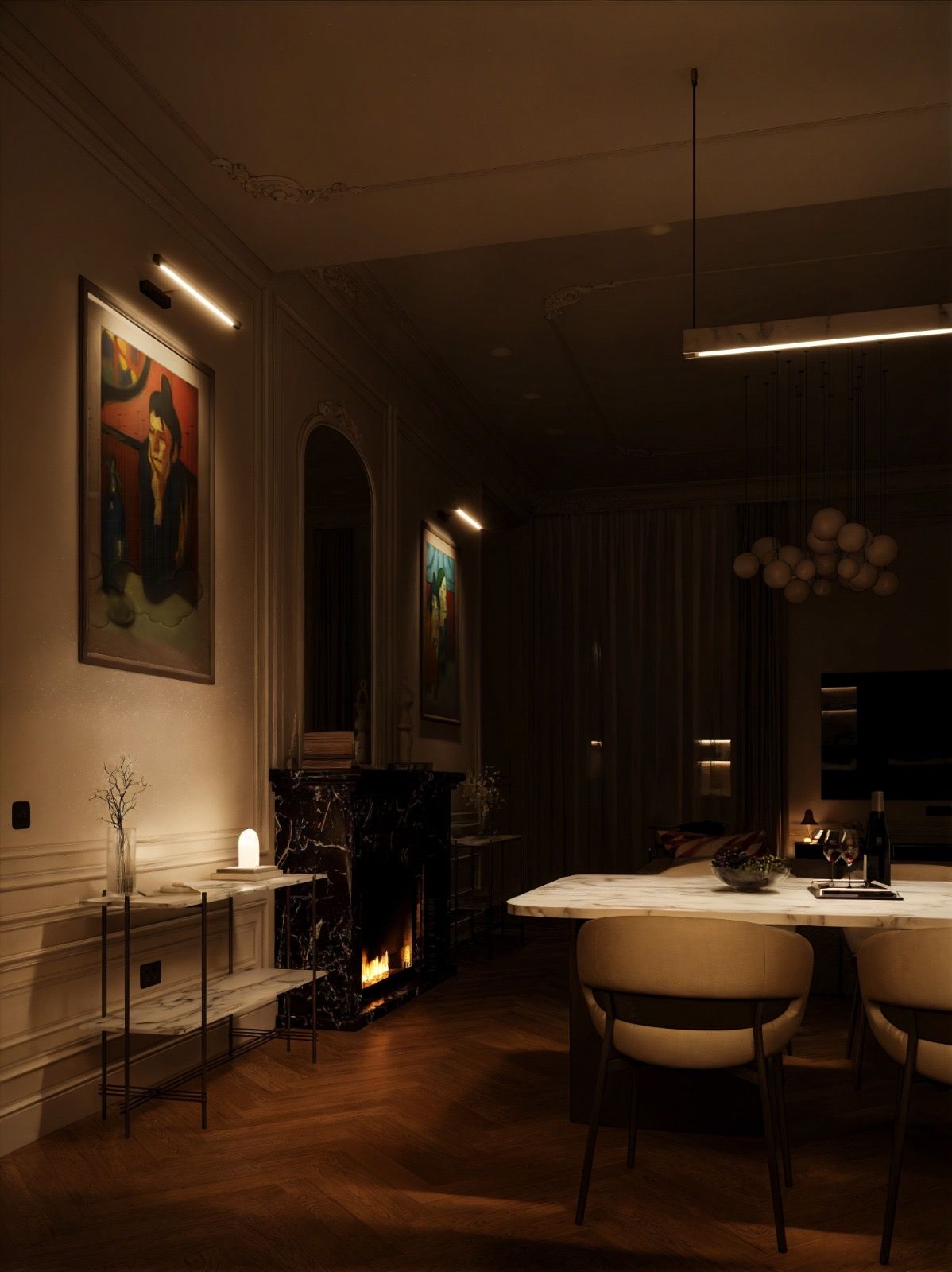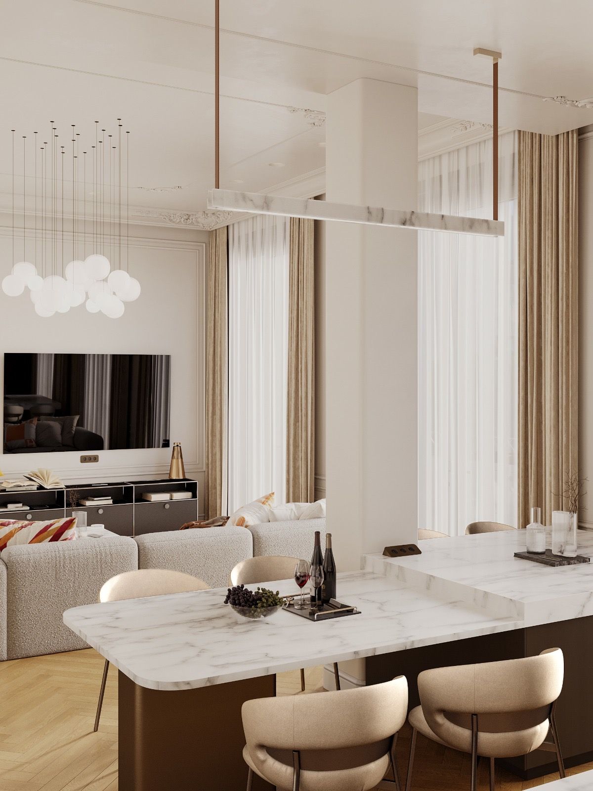 Кухня — зал студия, небольшая спальня с отдельностоящей ванной за кроватью. Интерьер задуман, как классический французский, с обильной лепниной на стенах и потолках, большим камином из красного мрамора, но с очень модным освещением и современной акцентной футуристичной мебелью.
