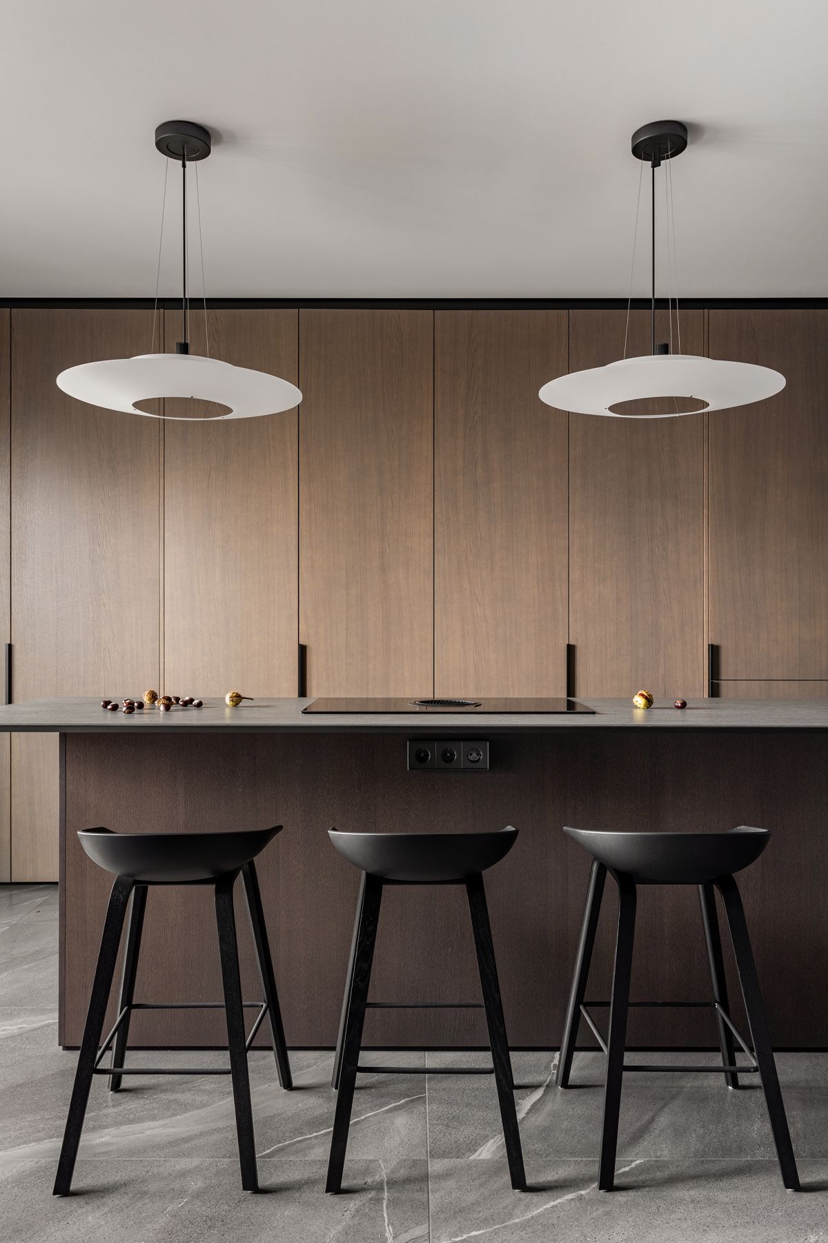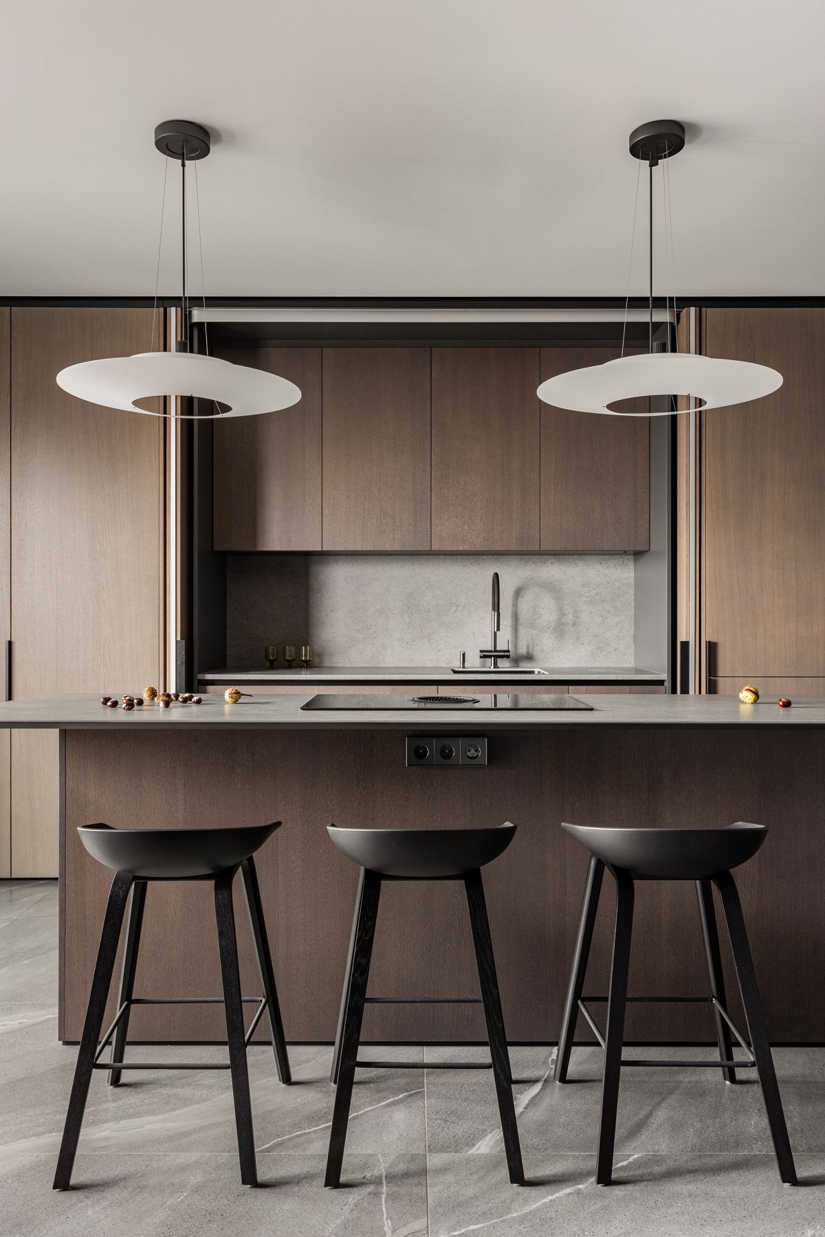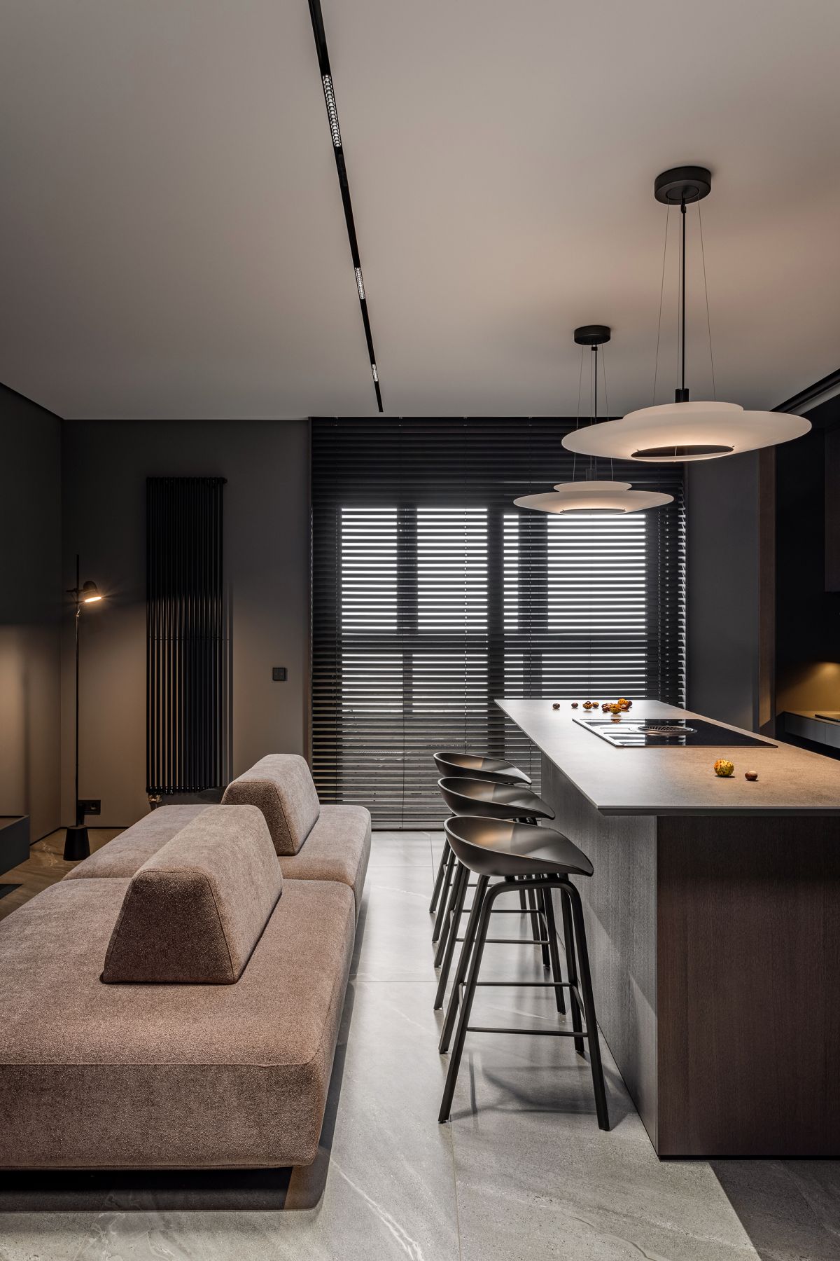 Закрытая кухня с изящными складными фасадами гармонично дополняется островом с варочной плитой и интегрированной в нее вытяжкой. Диван с нестандартными формами и парящий шкаф в прихожей создают атмосферу легкости. Сложные темные тона интерьера придают глубину и уют, а использование зеркал визуально расширяет пространство.
