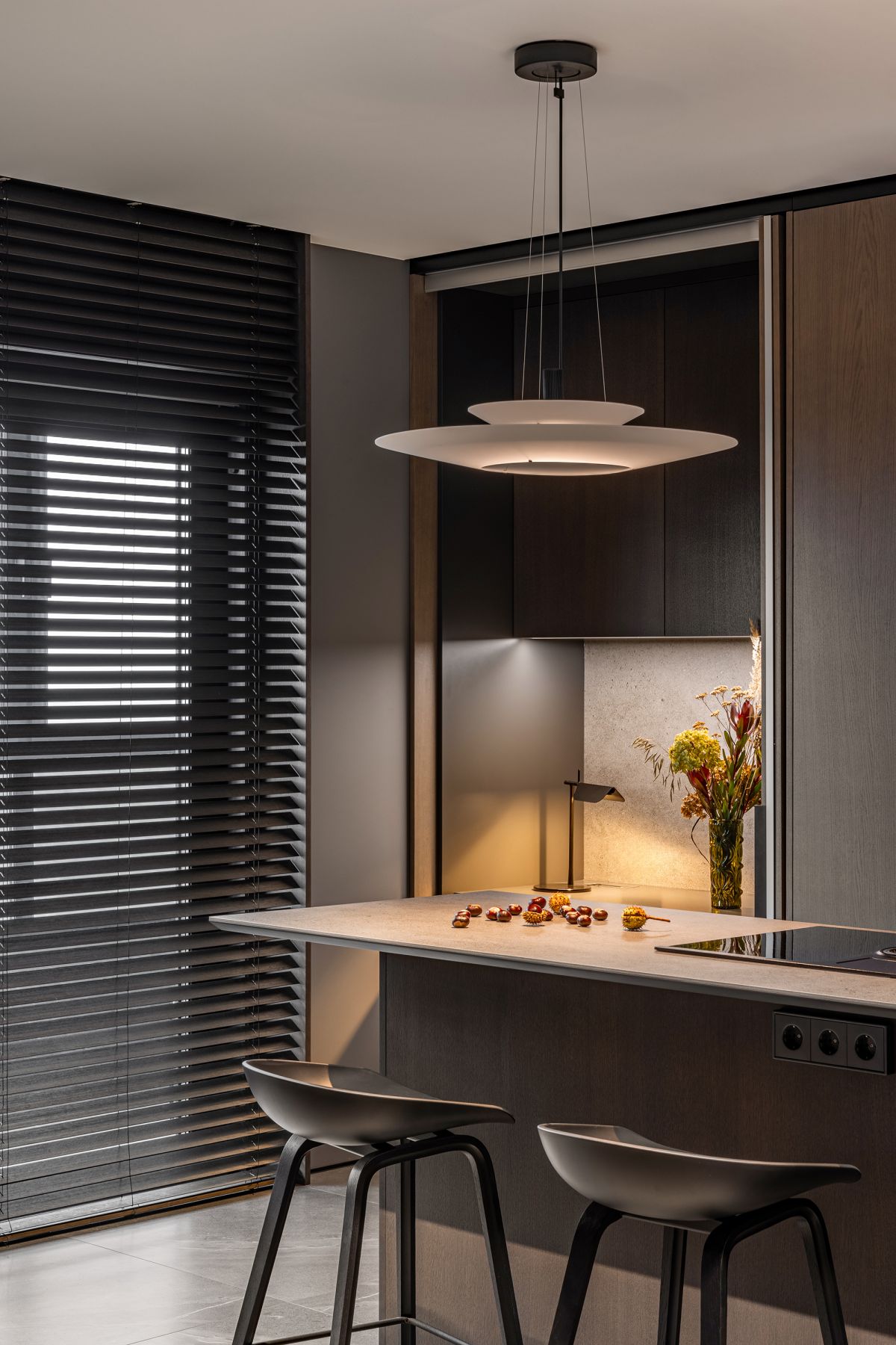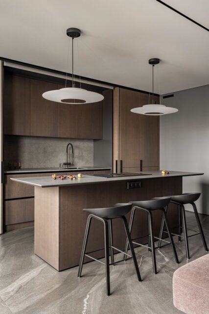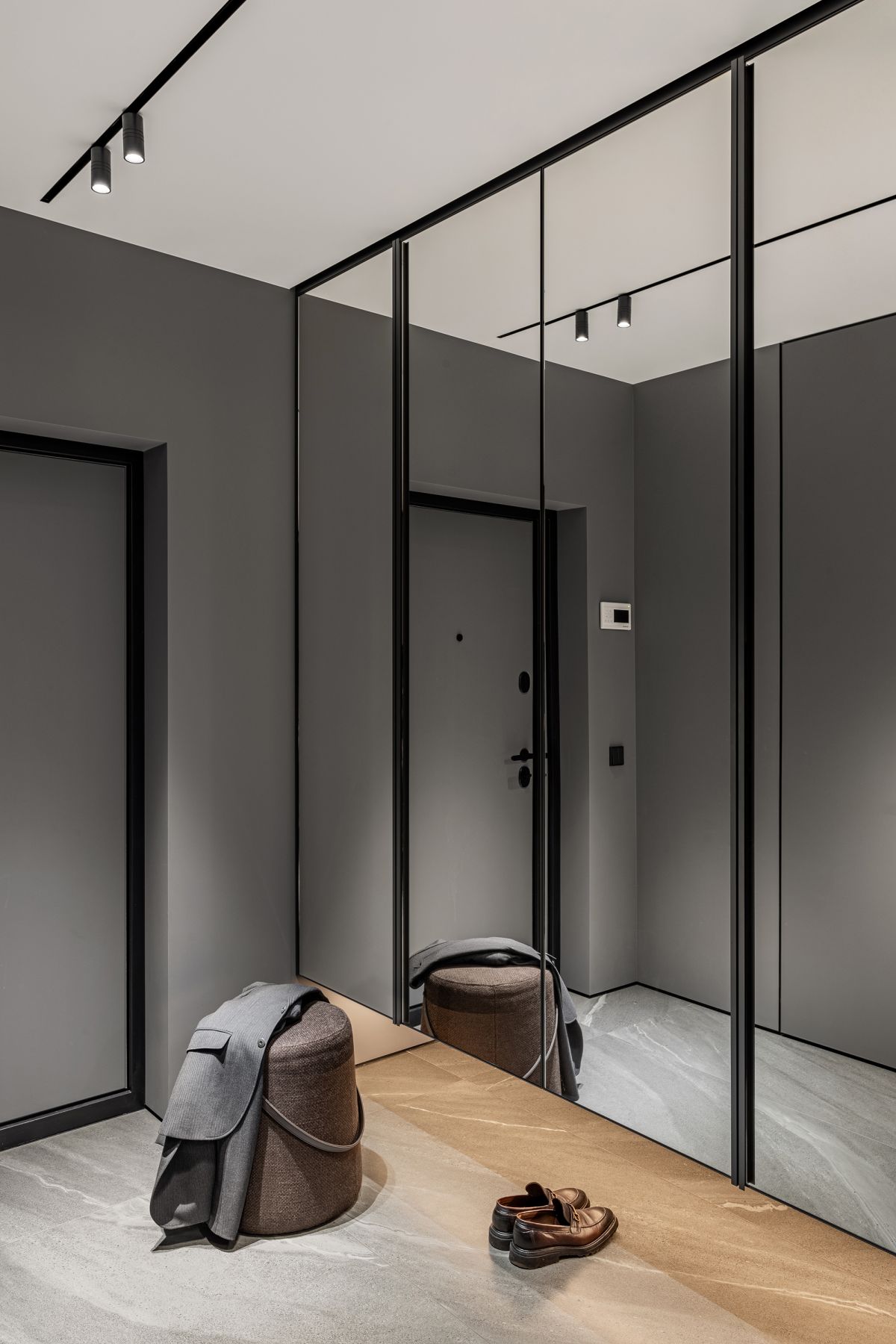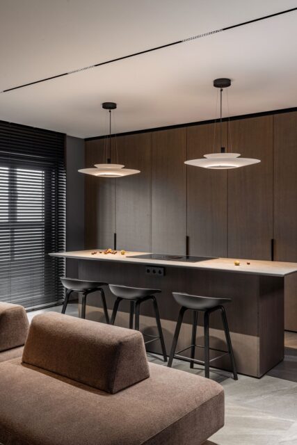 Закрытая кухня с изящными складными фасадами гармонично дополняется островом с варочной плитой и интегрированной в нее вытяжкой. Диван с нестандартными формами и парящий шкаф в прихожей создают атмосферу легкости. Сложные темные тона интерьера придают глубину и уют, а использование зеркал визуально расширяет пространство.