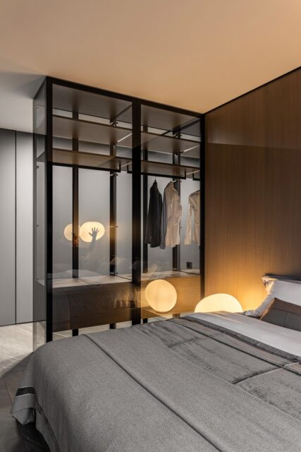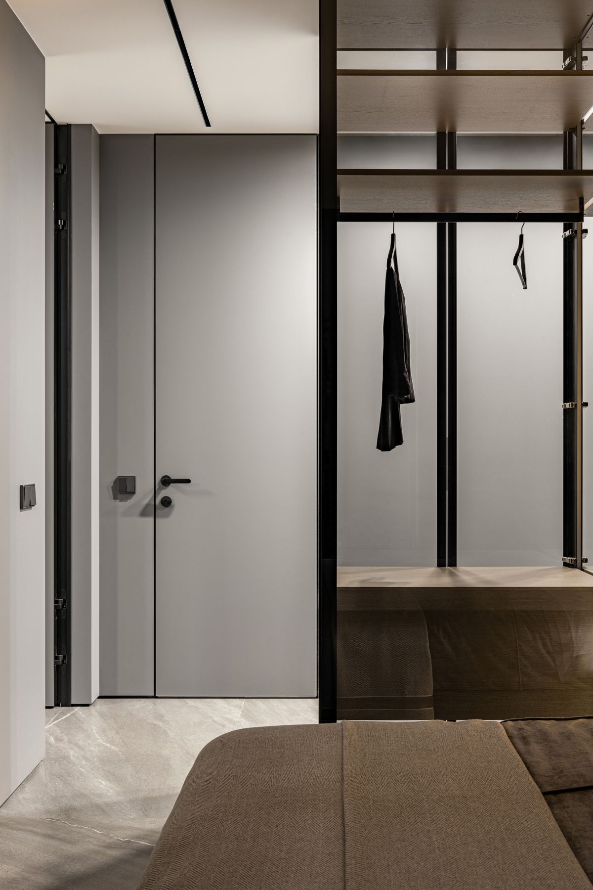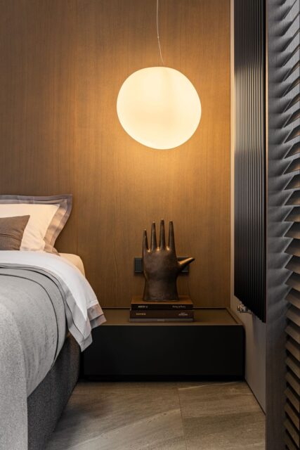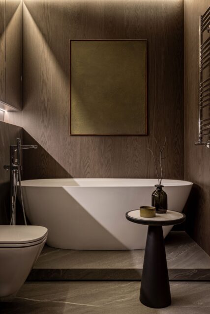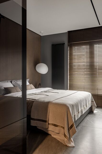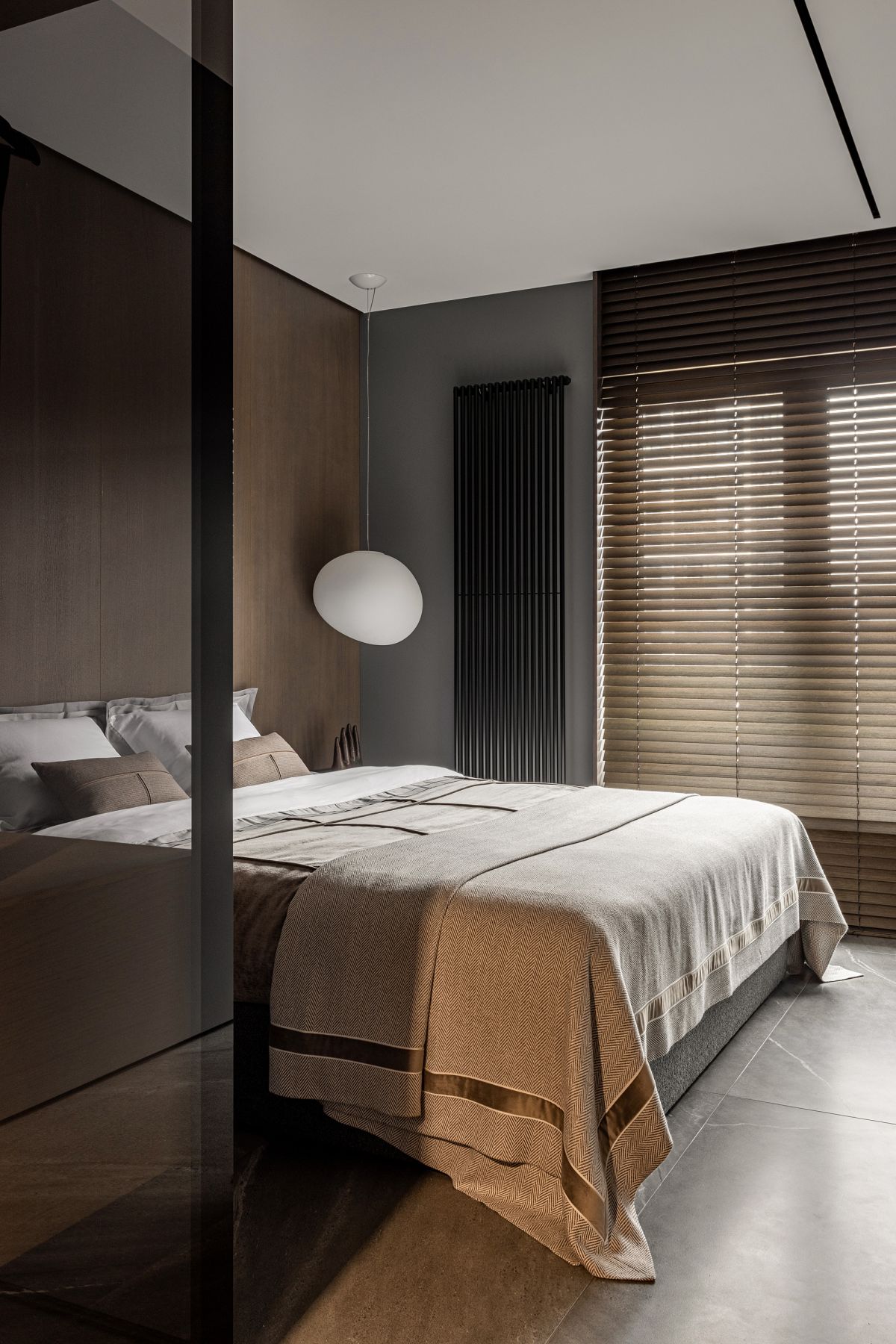 Мастер-спальня — это уединенное пространство с гардеробной и уютной ванной, отделанной керамогранитом с текстурой дерева. Здесь нет привычного текстиля на окнах, что добавляет строгости и «мужского» характера.