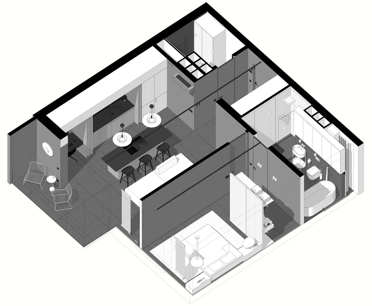 Квартира наполнена атмосферой дождливого Лондона и осенних прогулок, создавая ощущение гармонии и стиля. Изначально стандартная отделка и типичная планировка были преобразованы в открытое многофункциональное пространство с разделением на приватную и общественную зоны.