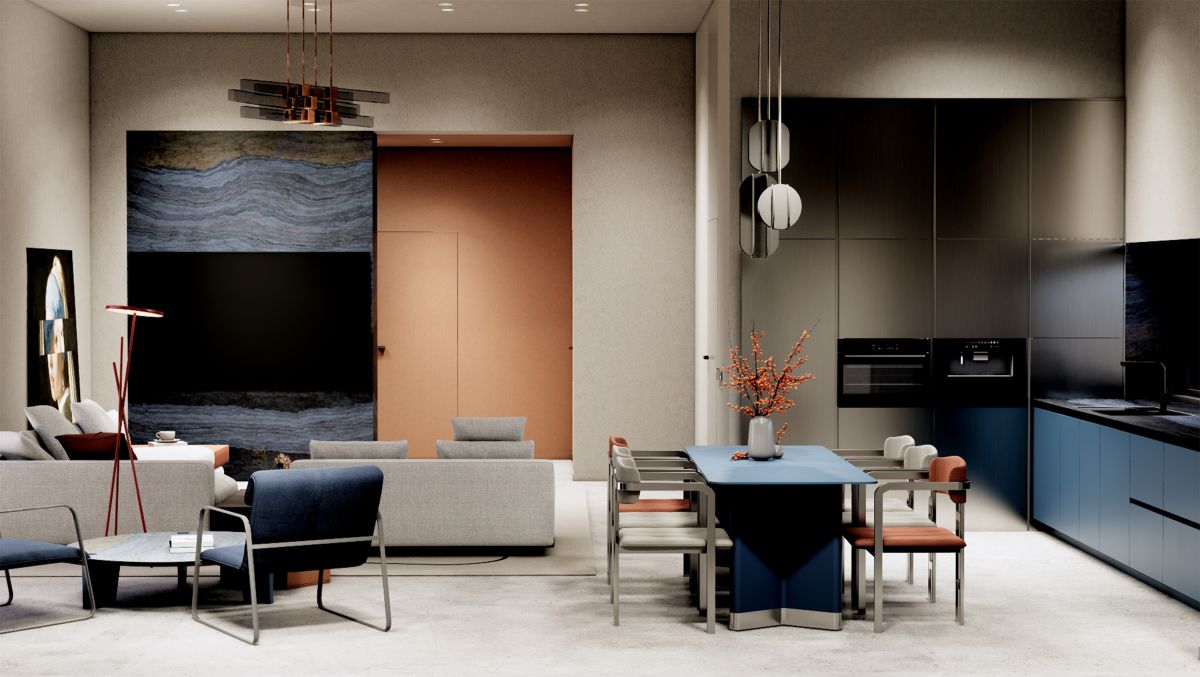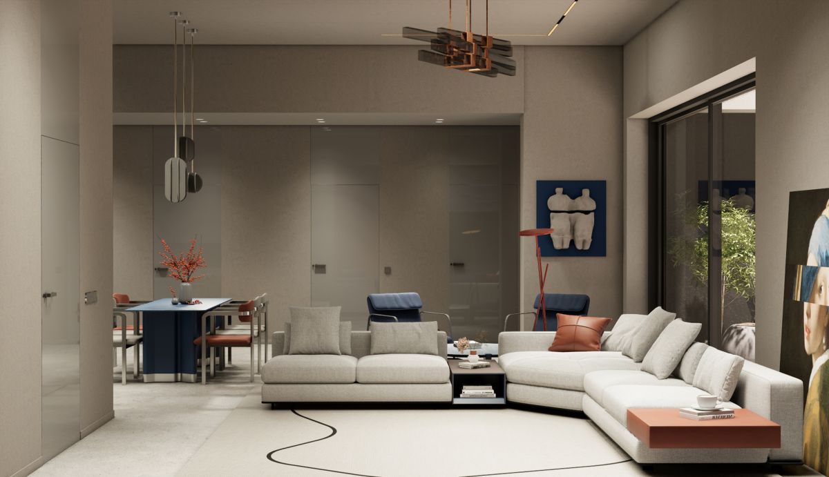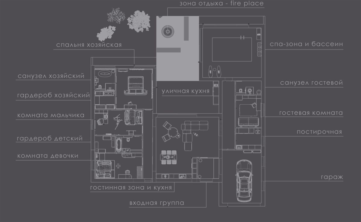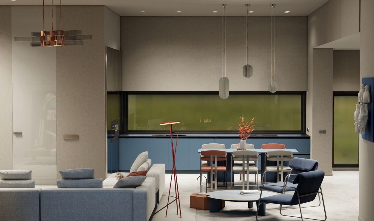 Планировка дома разделена на две зоны — жилая и гостевая. При входе в жилую часть дома нас встречает просторная гостевая комната совмещенная с зоной кухни и обеденной зоной .При желании все желающие дома могут приготовить пищу на уличной кухне и провести время возле зоны — огня. Зона гостиной является сердцем дома наполненное простором и минимализмом, основное настроение комнаты передают серо-бежевые тона с акцентами приглушенно-синего и терракотового оттенка сиена, а также использованием таких материалов как сталь, стекло, керамика.