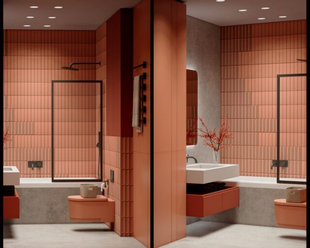 Комната мальчика выполнена в более брутальных и темных угольно серых тонах с акцентами оранжевого тона. Комната мальчика отвечает всем запросам активного развития и досуга. Кроме того к детским комнатам прилегает общая гардеробная для дополнительного хранения, а так же компактный санузел выполненный из рельефной мелко форматной керамики в оттенках кораллового рифа.