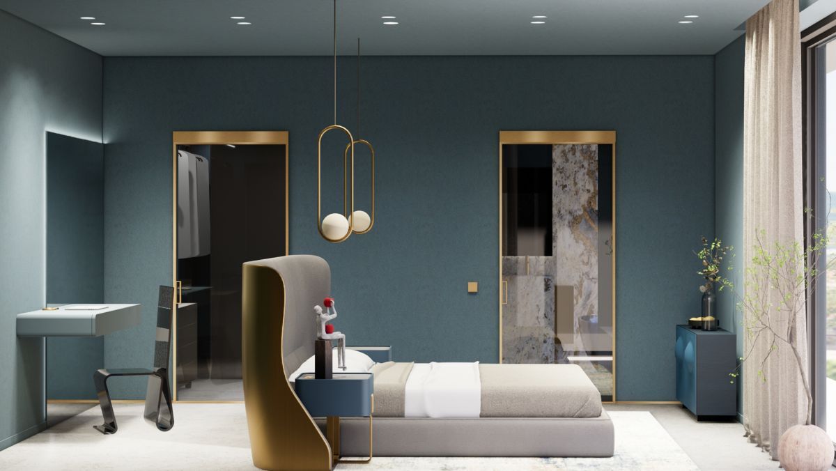 Следующая группа помещений открывается нам при входе в спальную зону отдыха для хозяев дома, имеют отдельную гардеробную зону и санузел с панорамным видом при принятии ванны. Островное спальное место позволяет при отдыхе почувствовать простор комнаты и насладиться ландшафтом и приватным видом из окна.